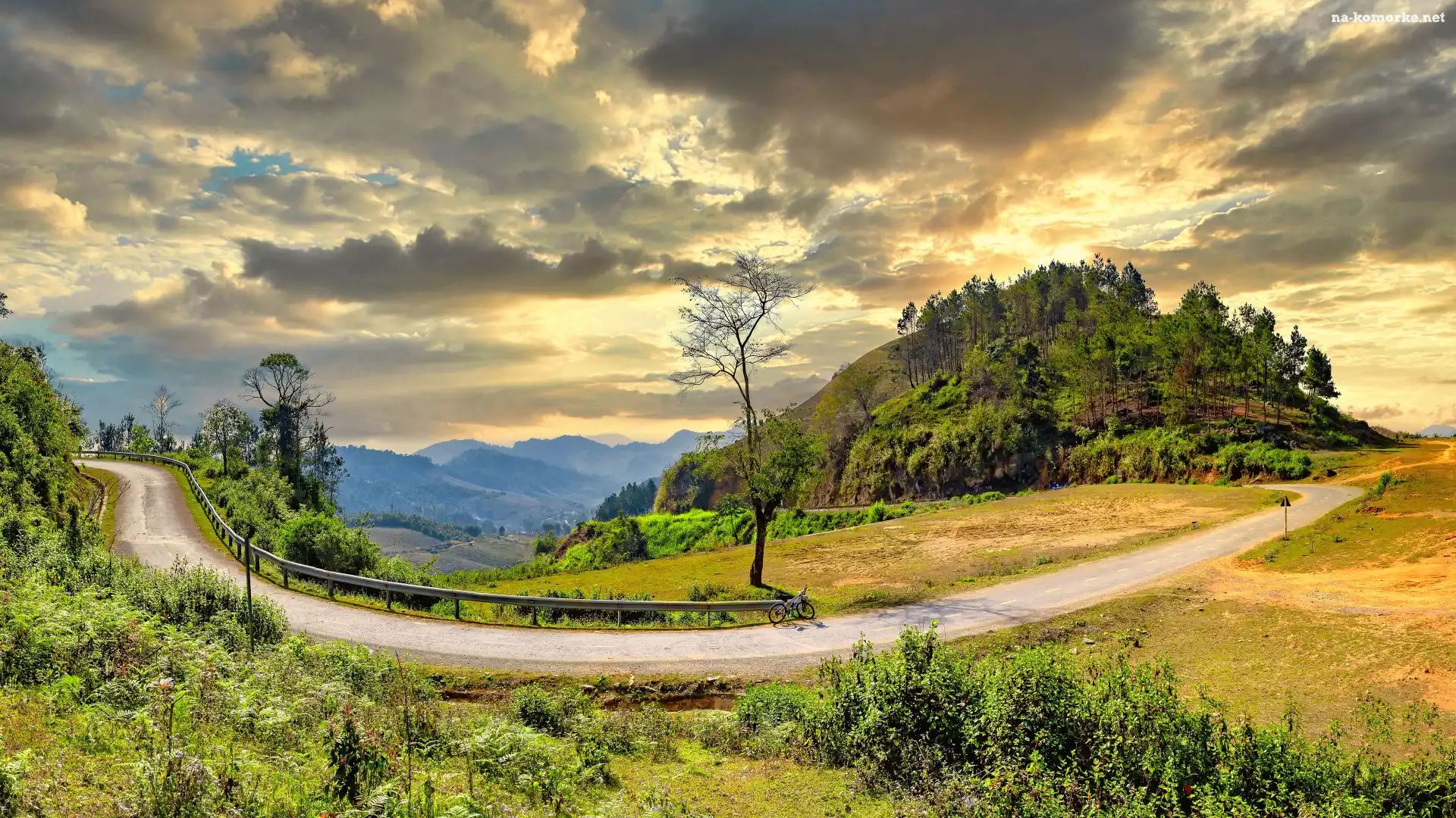 Góry, Drzewa, Niebo, Droga, Chmury Łąka na Komórkę