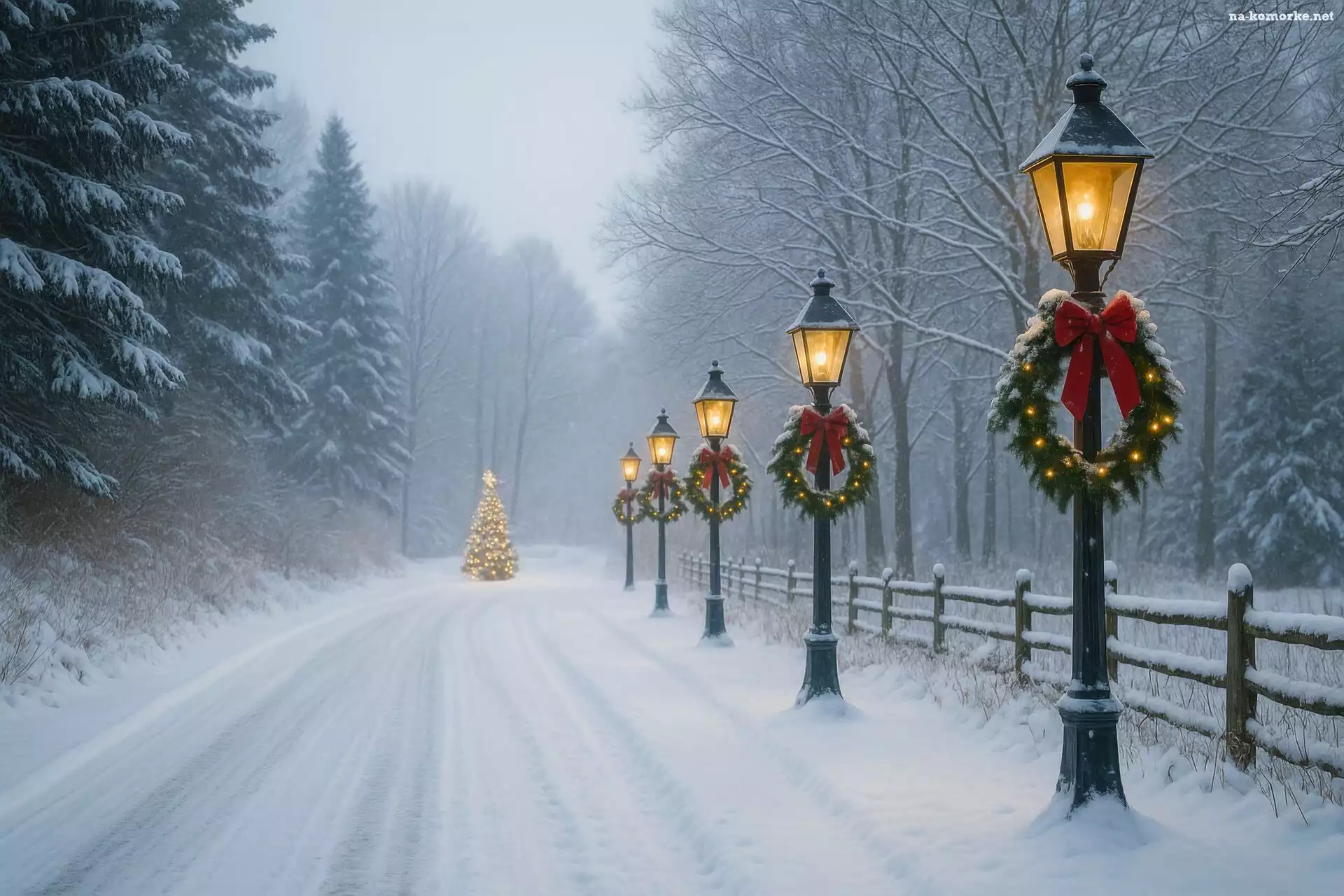 Droga, Mgła, Wieńce, Boże Narodzenie, Choinka, Las, Latarnie, Zima na Komórkę