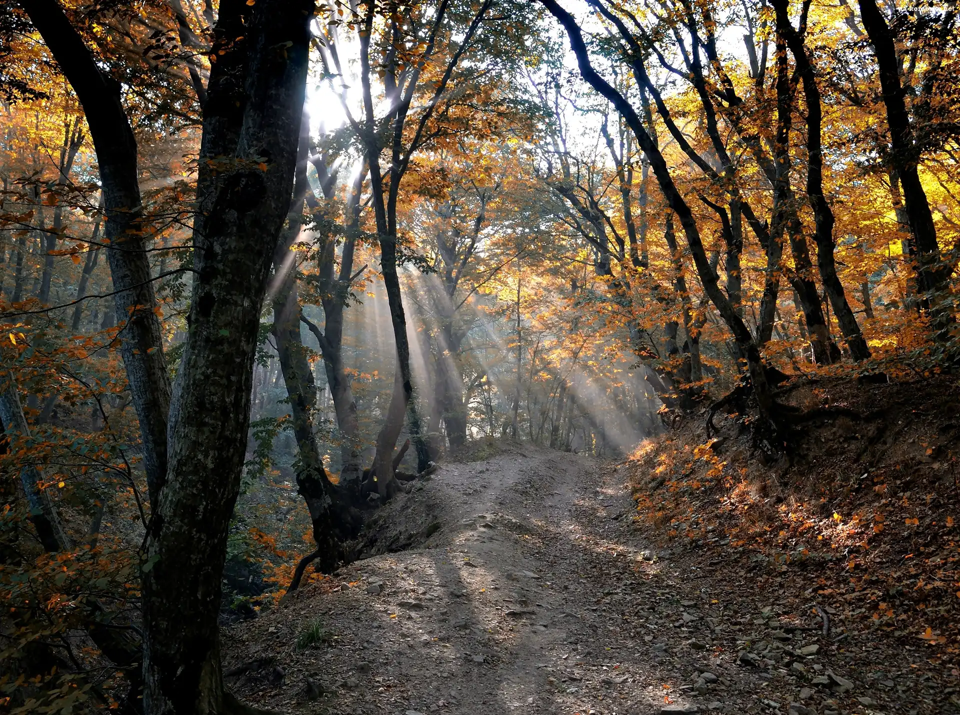Droga, Drzewa, Jesień, Światło, Las, Przebijające na Komórkę