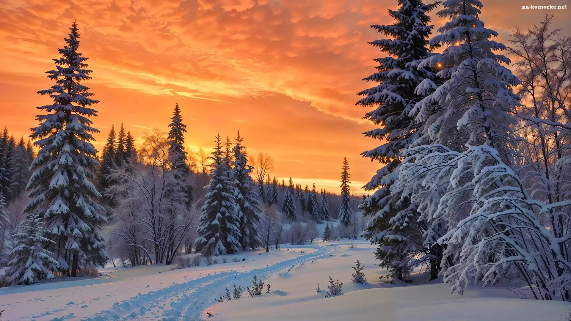 Drzewa, Zima, Las, Droga, Ośnieżony, Zachód słońca na Komórkę