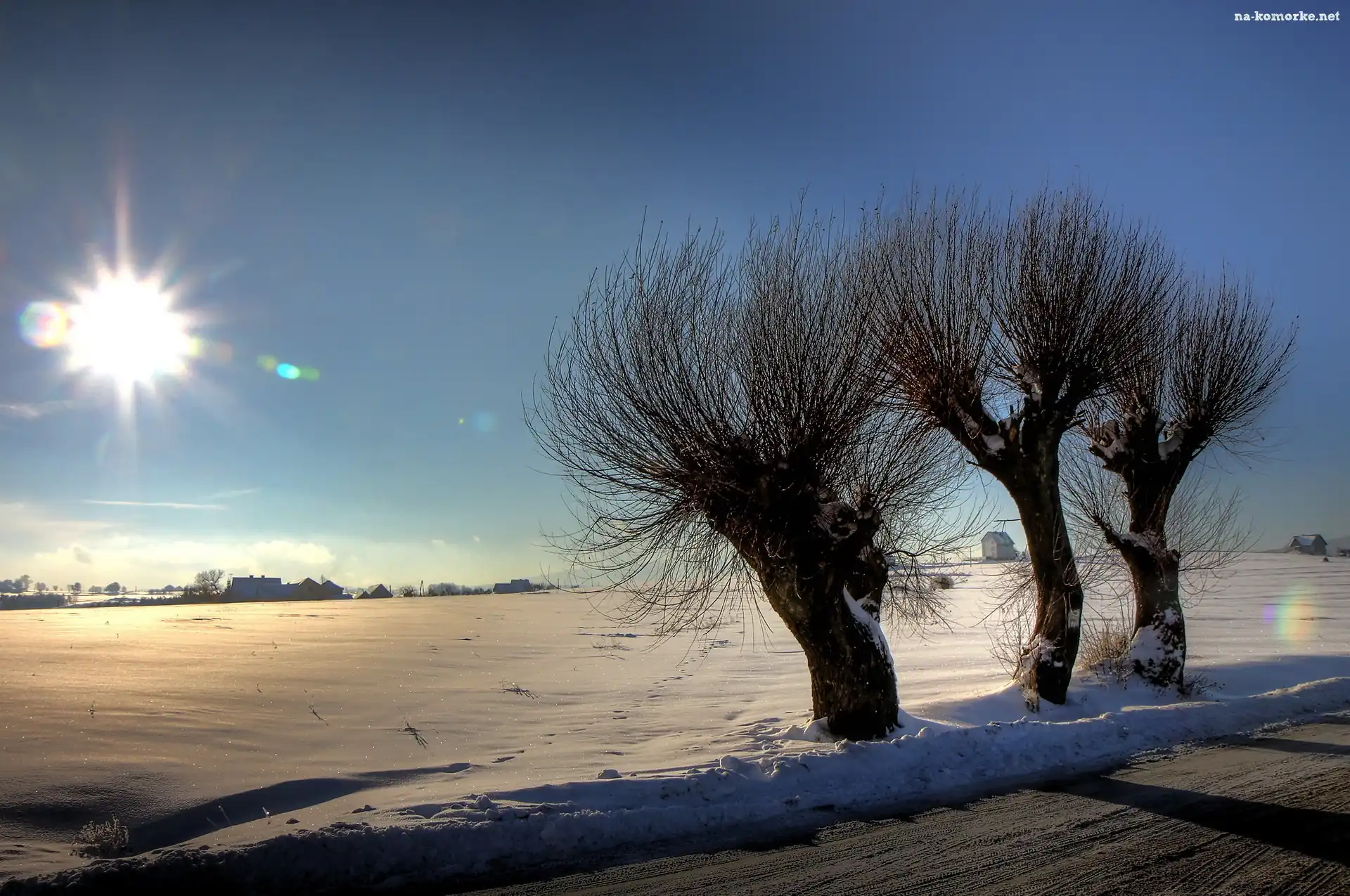 Śnieg, Słońce, Droga, Drzewa na Komórkę