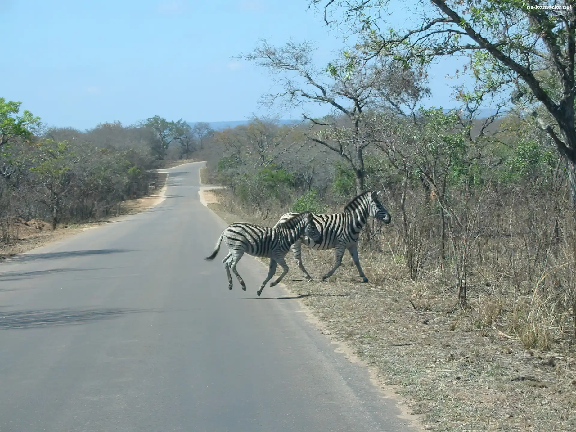 zebry, drzewa, droga na Komórkę