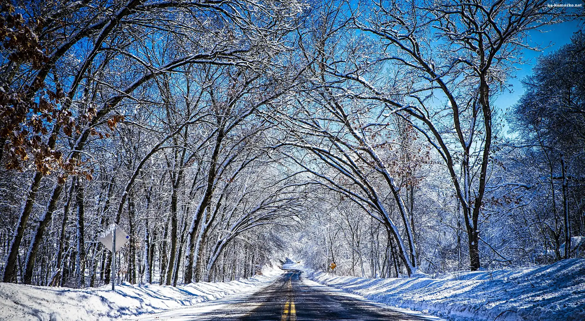 Droga, Drzewa, Zima, Śnieg na Komórkę
