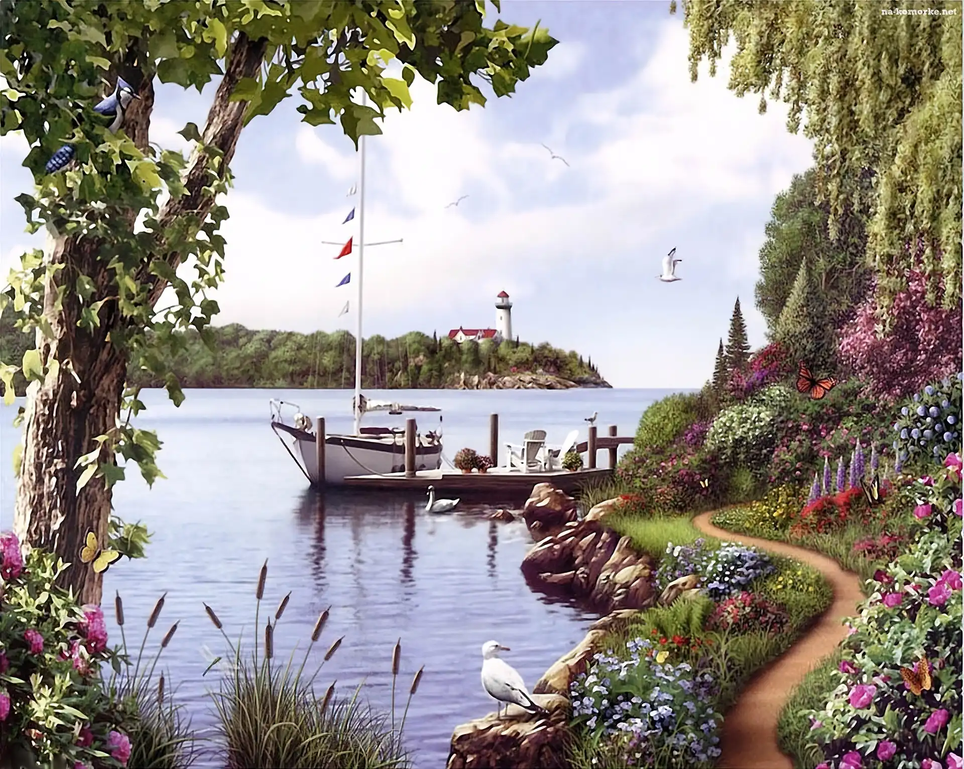 Dróżka, Jezioro, Jacht, Kwiaty, Mewa na Komórkę