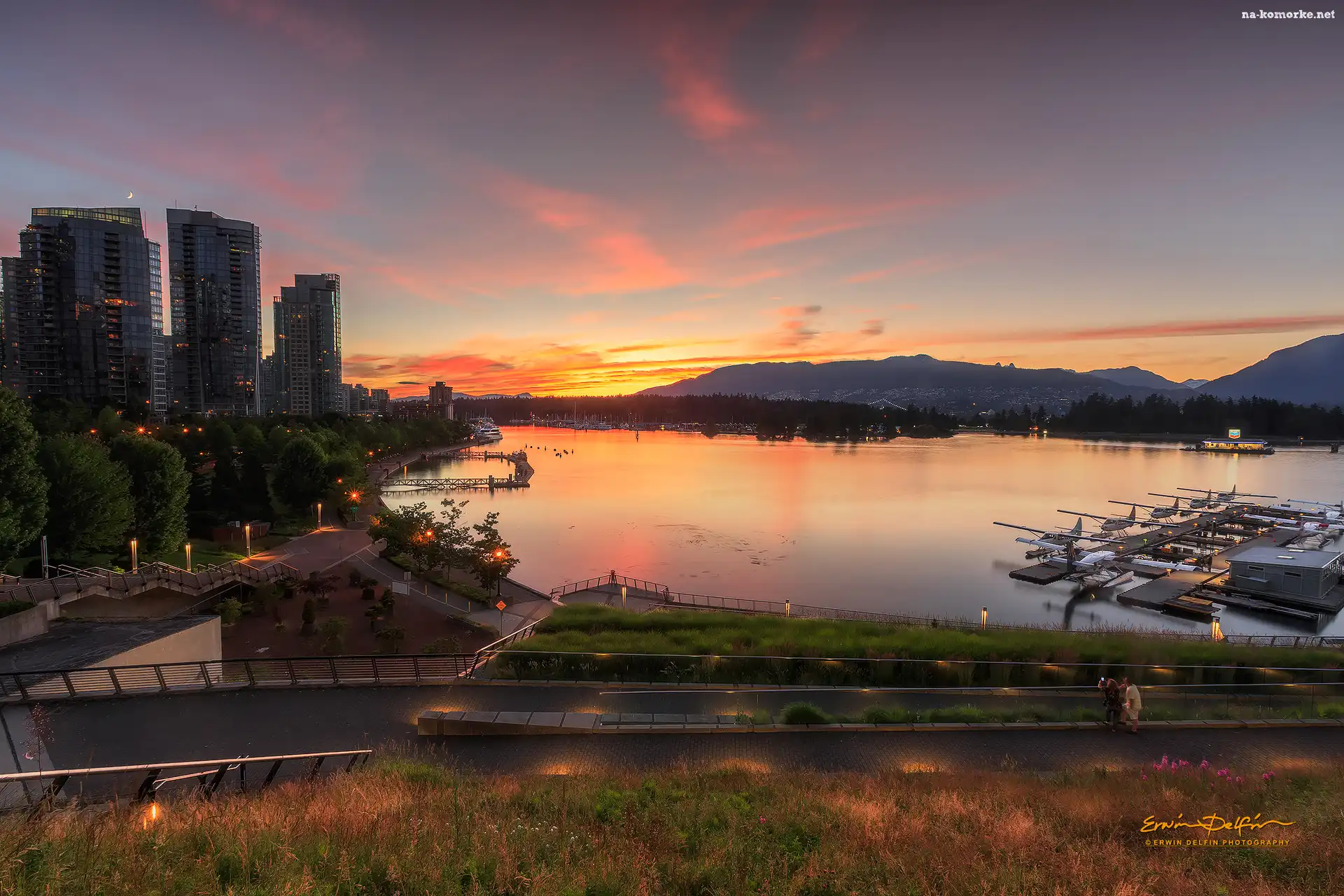Żaglówki, Wschód słońca, Drzewa, Wieżowce, Kanada, Zatoka, Coal Harbour, Góry, Vancouver, Chmury, Przystań na Komórkę |