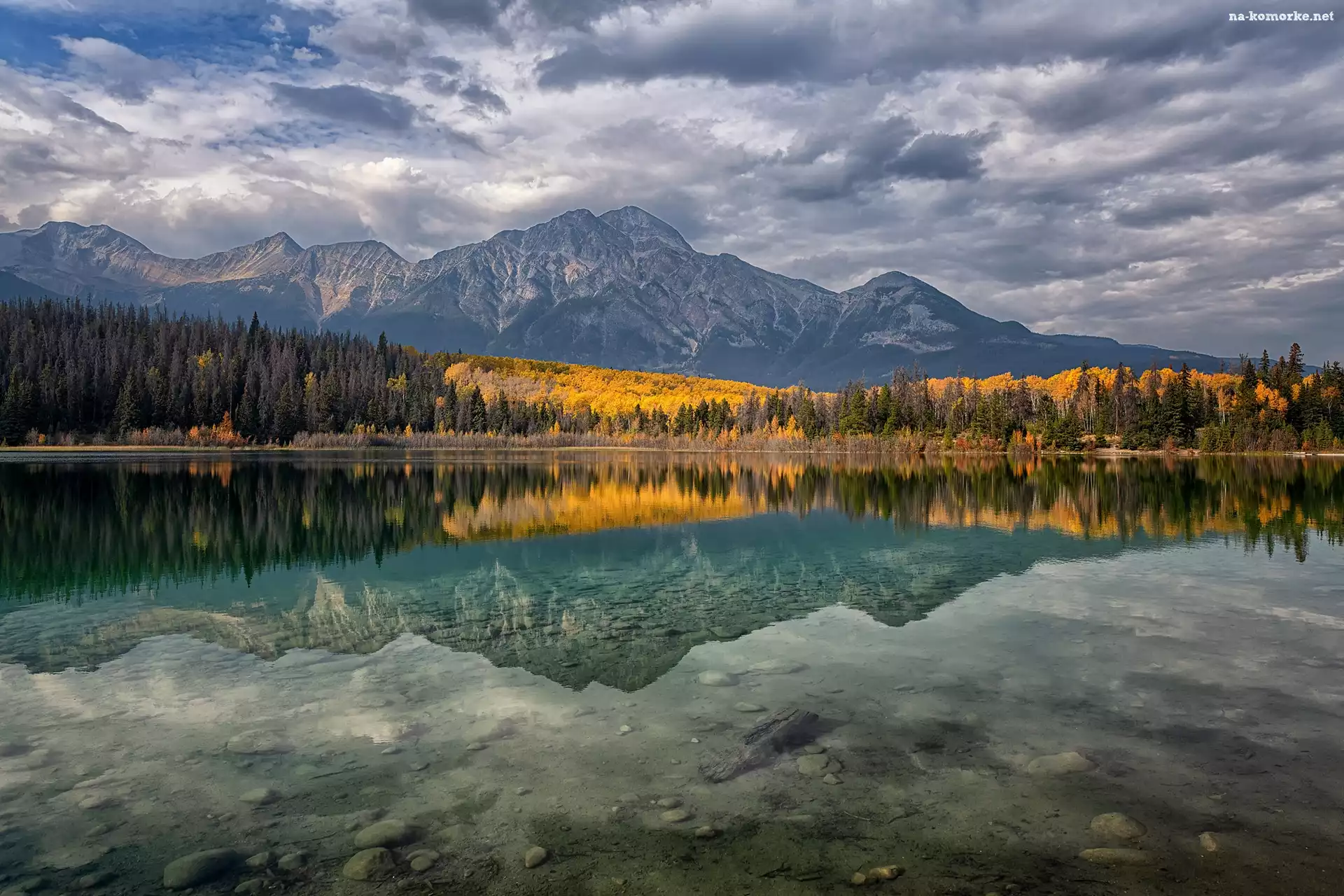 Jesień, Patricia Lake, Drzewa, Jezioro, Park Narodowy Jasper, Prowincja Alberta, Kanada, Odbicie, Góry na Komórkę |