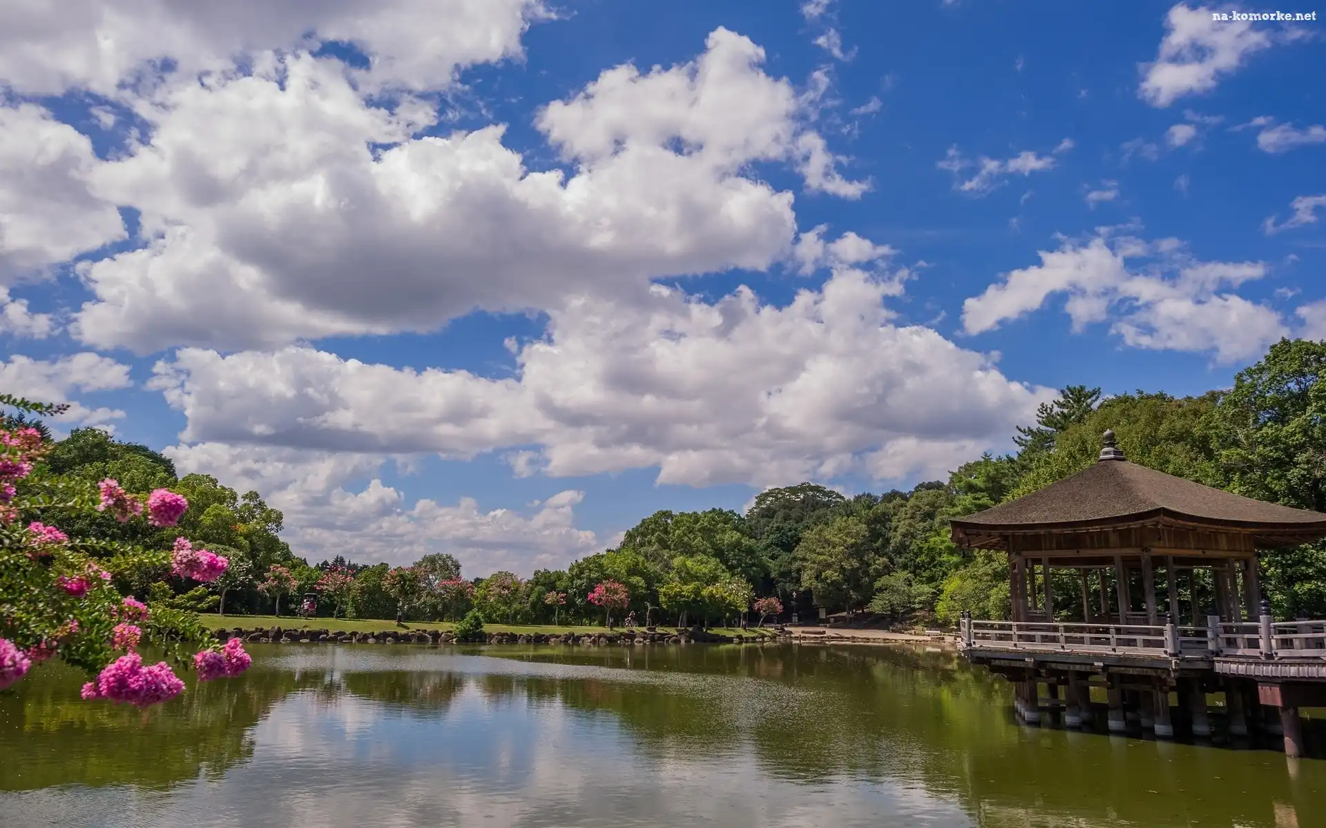 Drzewa, Park, Jeziorko, Altanka, Kwitnące na Komórkę