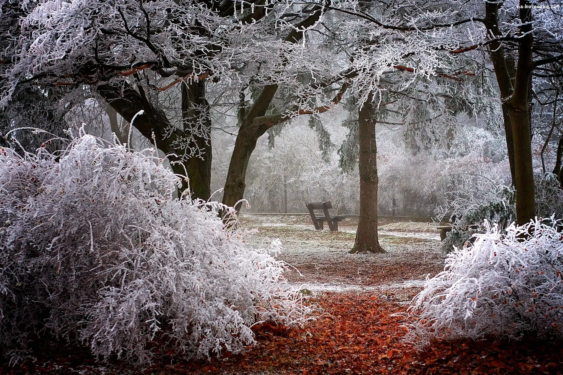Drzewa, Zima, Park, Ławka, Oszronione na Komórkę