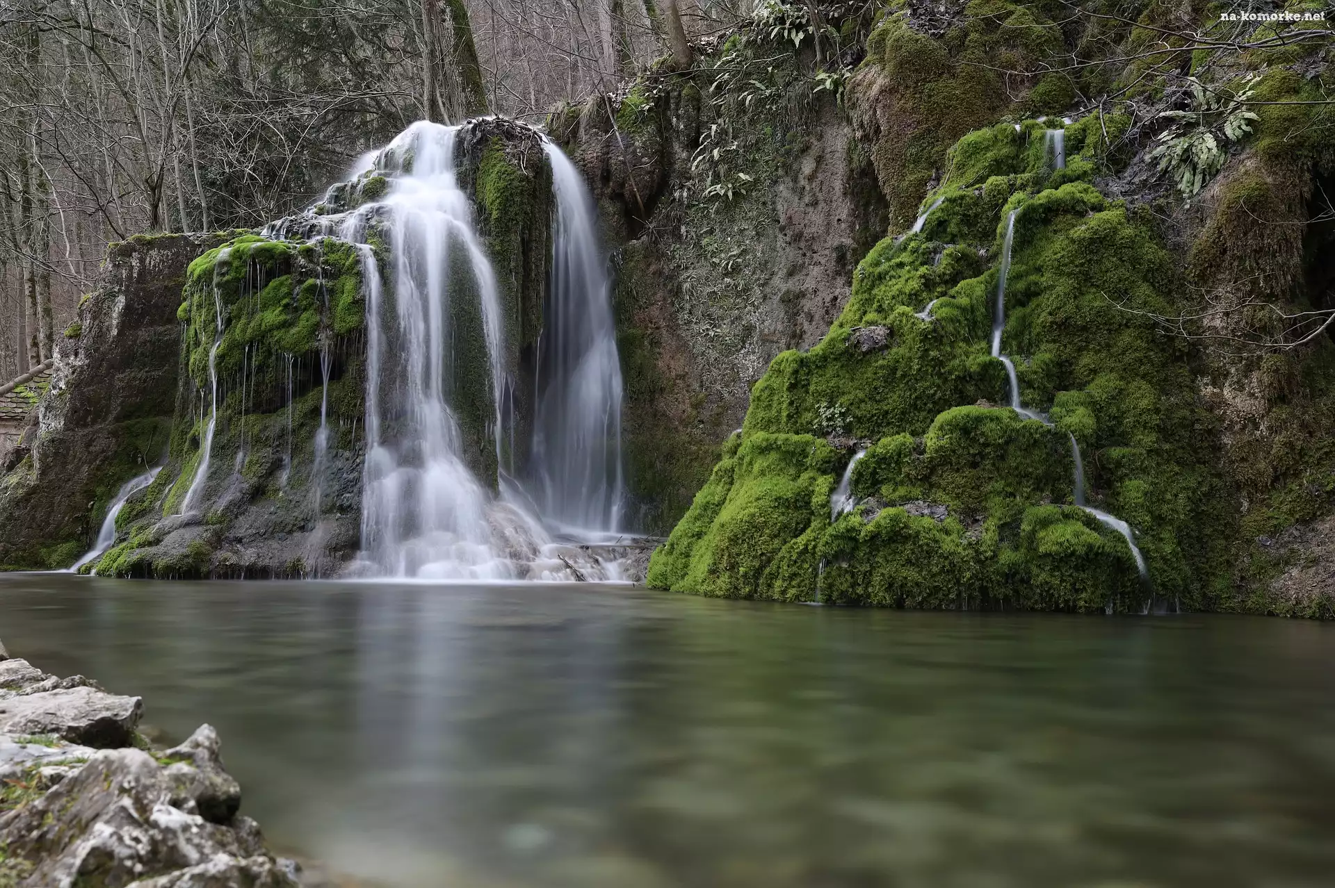 Wodospad Gutersteiner, Bad Urach, Niemcy, Rzeka, Omszałe, Skały, Drzewa na Komórkę