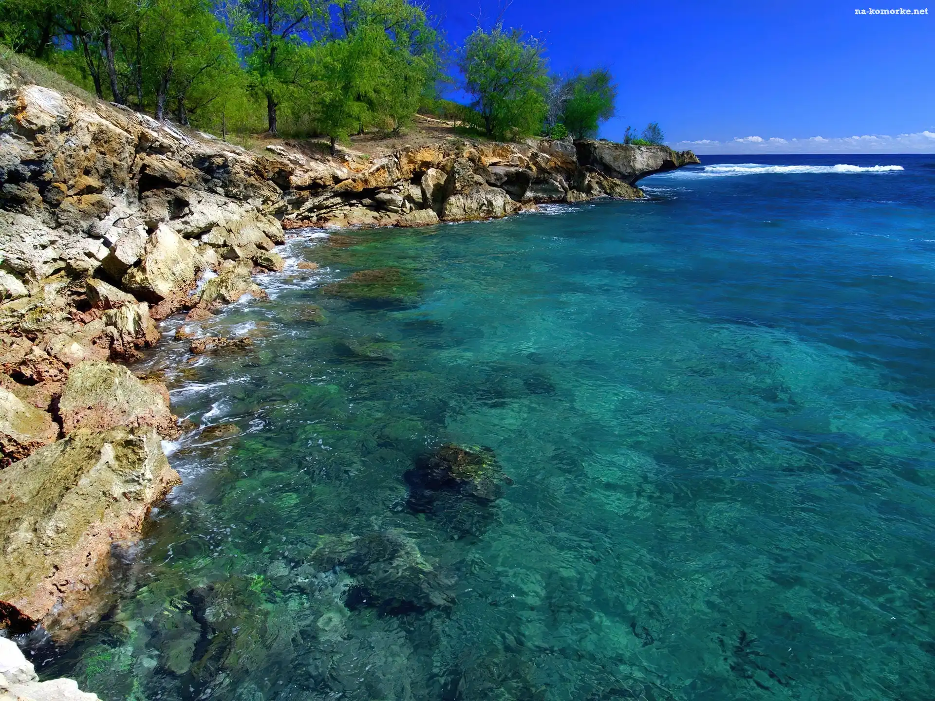 Kauai, Morze, Drzewa, Hawaje, Brzeg, Skalisty na Komórkę