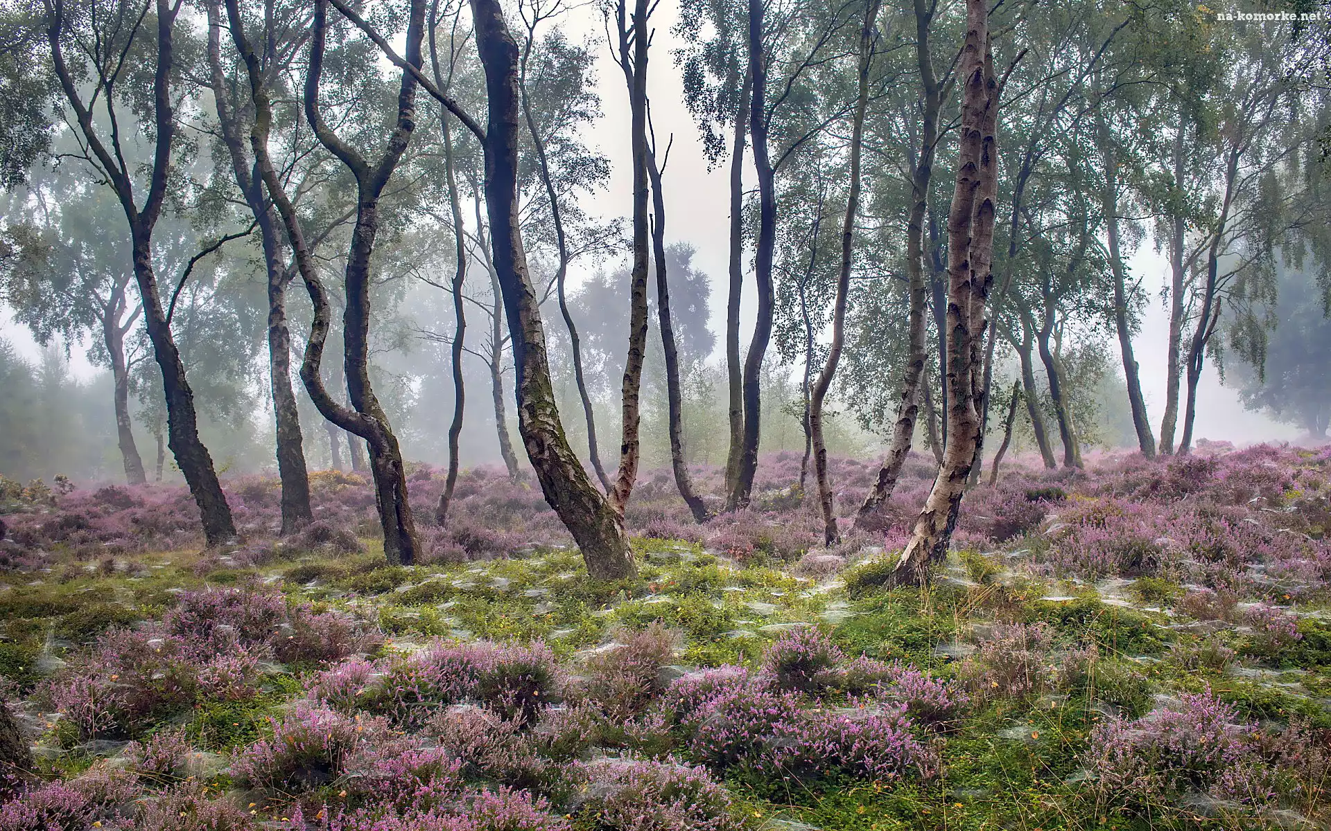 Anglia, Wrzosowisko, Mgła, Park Narodowy Peak District, Stanton Moor, Drzewa, Brzozy na Komórkę