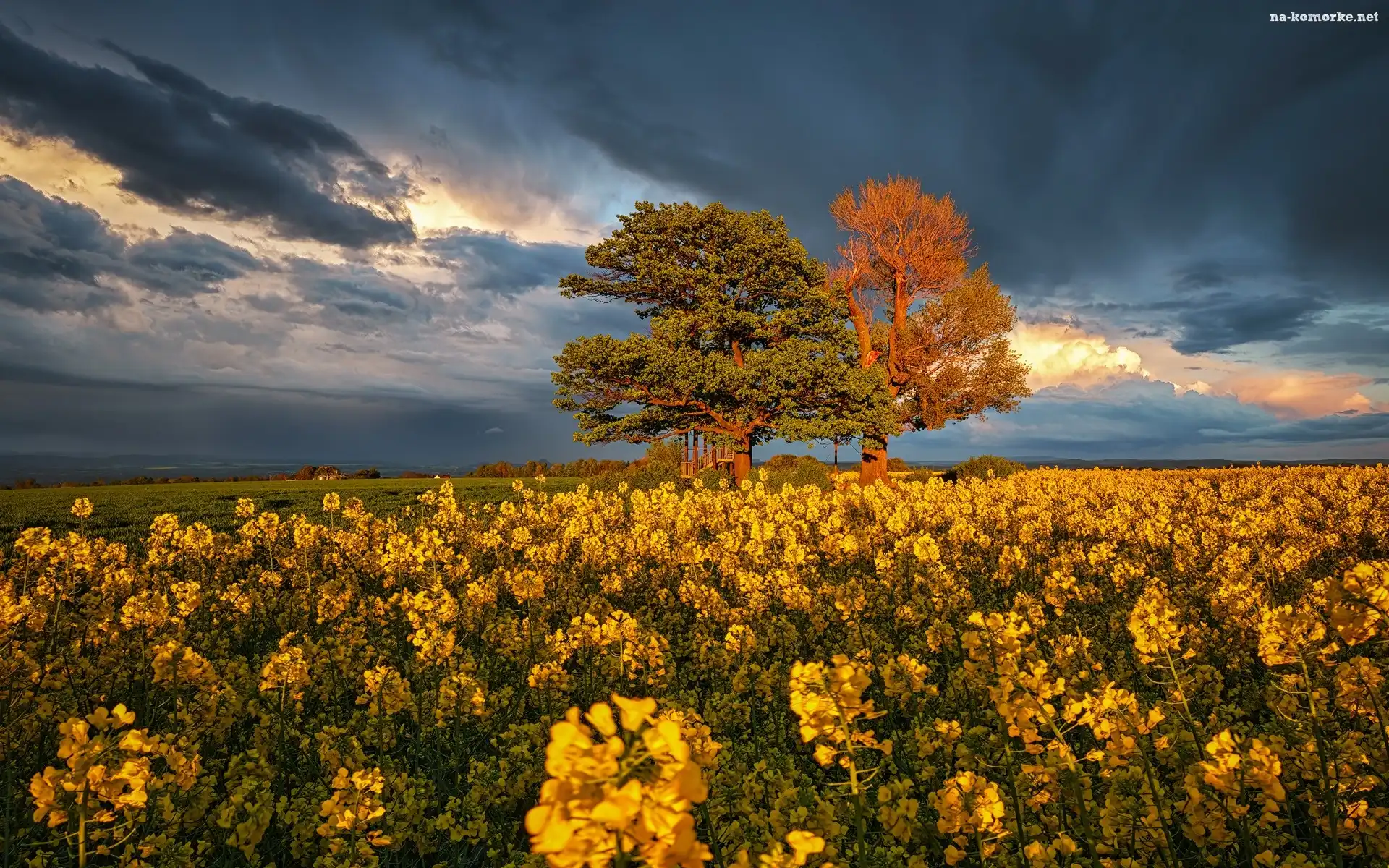 Pole, Drzewa, Ciemne, Rzepak, Chmury na Komórkę