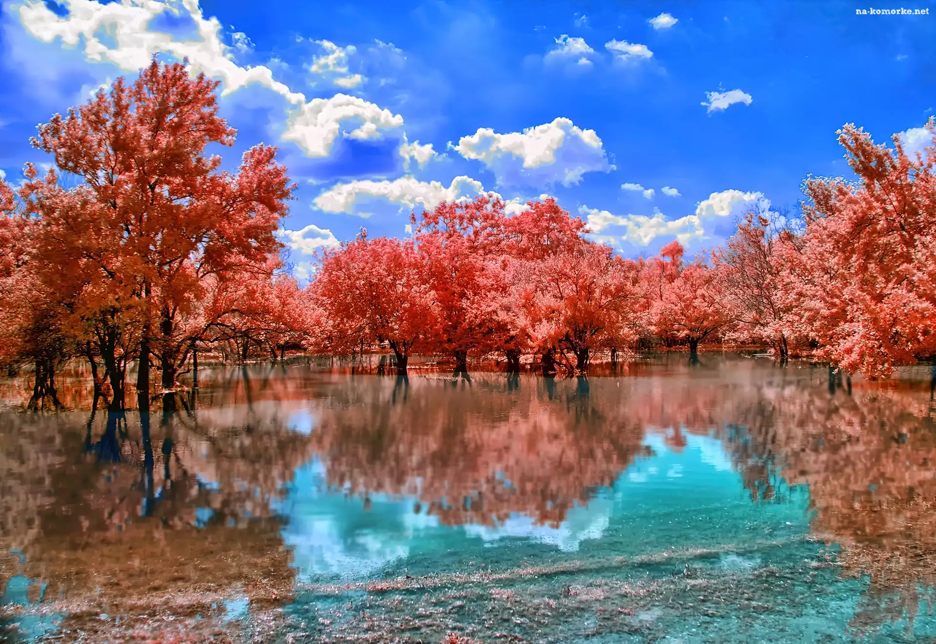 Drzewa, Jezioro, Czerwone, Liście na Komórkę