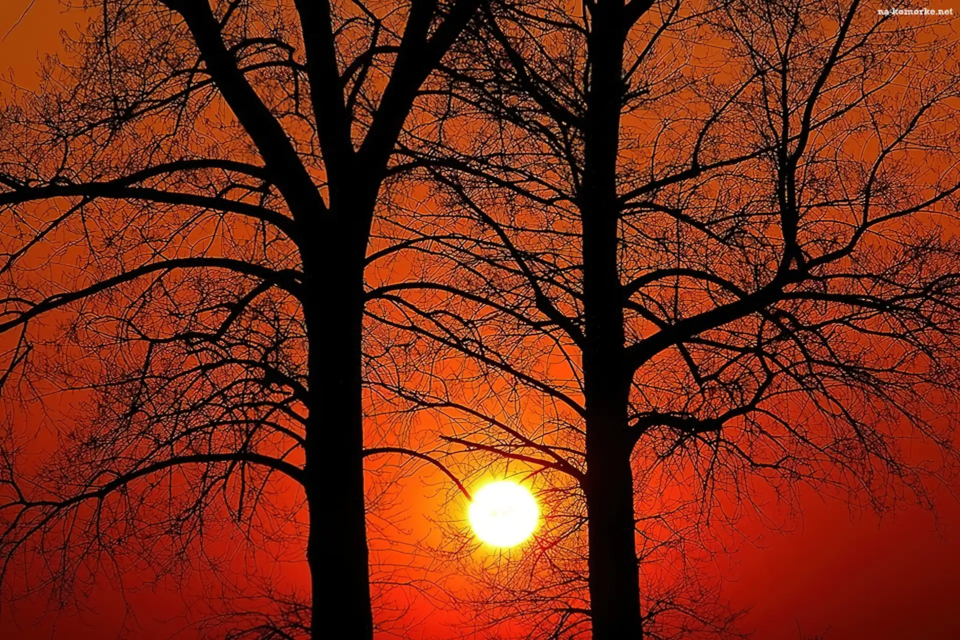 Drzewa, Słońca, Czerwony, Zachód na Komórkę