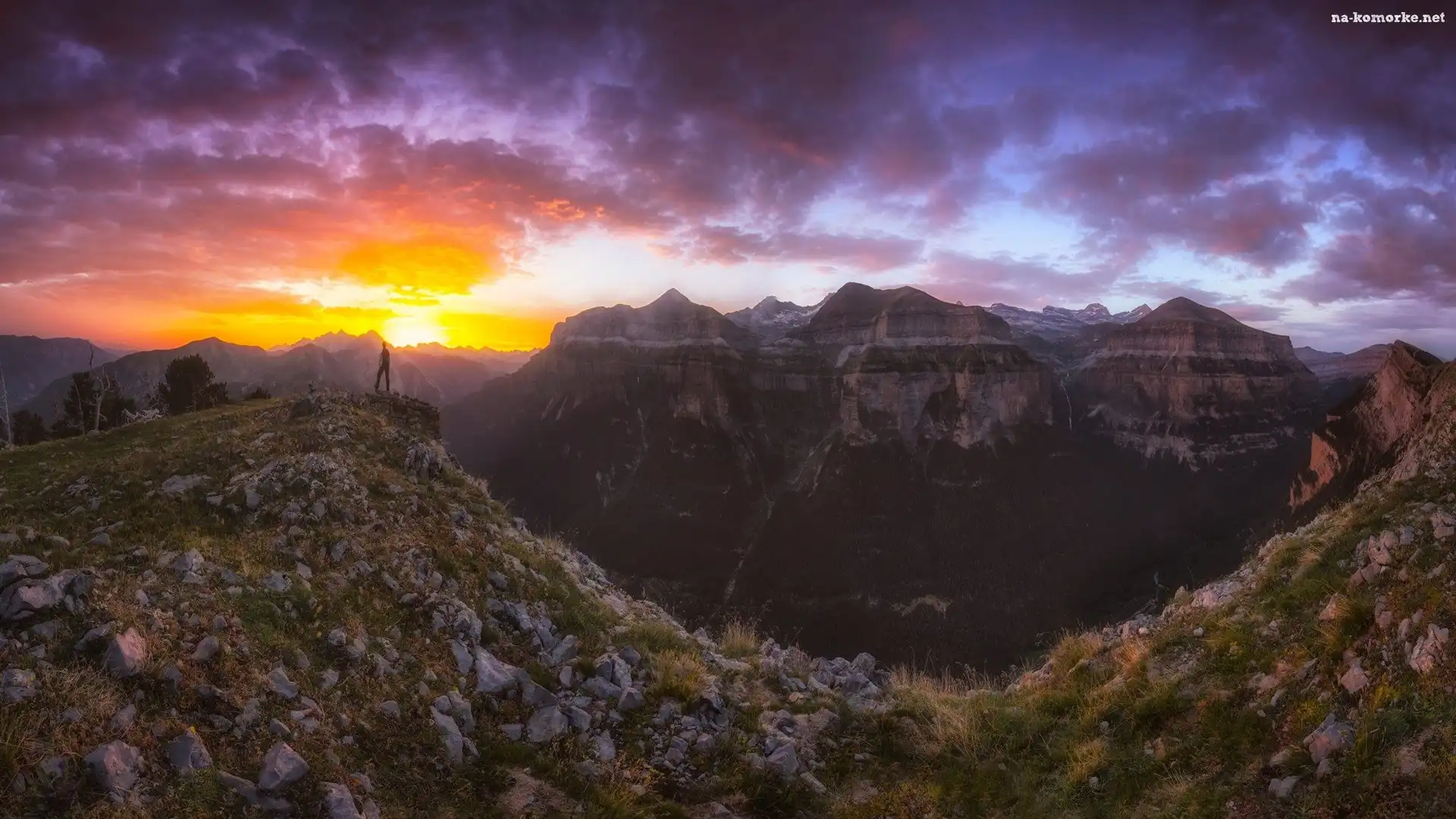 Człowiek, Drzewa, Góry, Chmury, Kamienie, Zachód słońca na Komórkę