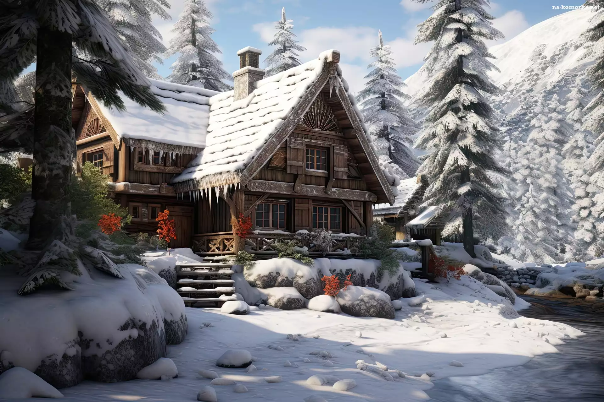 Zima, Drzewa, Dom, Las, Grafika na Komórkę