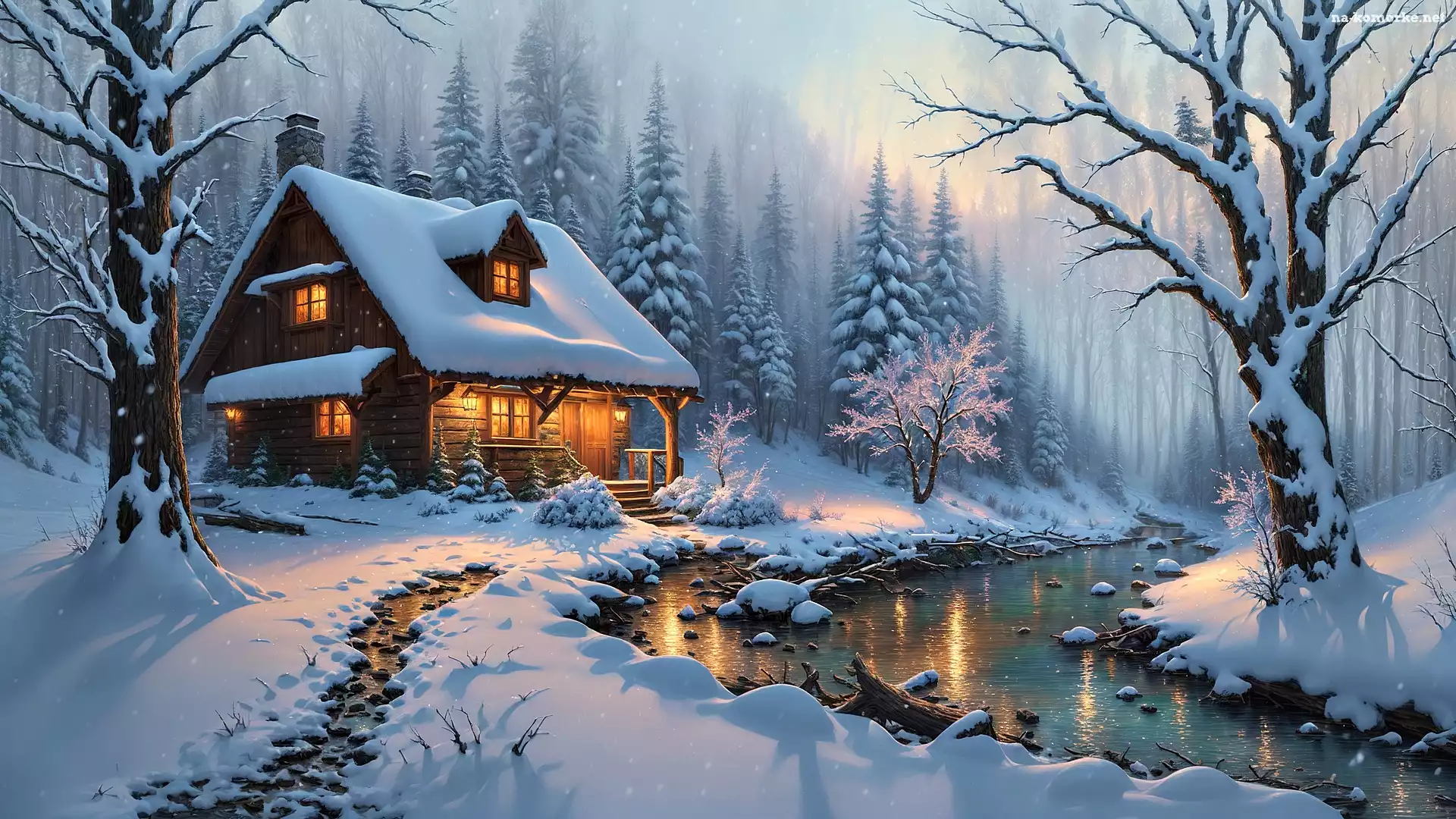 Grafika, Zima, Las, Drzewa, Rzeka, Dom na Komórkę