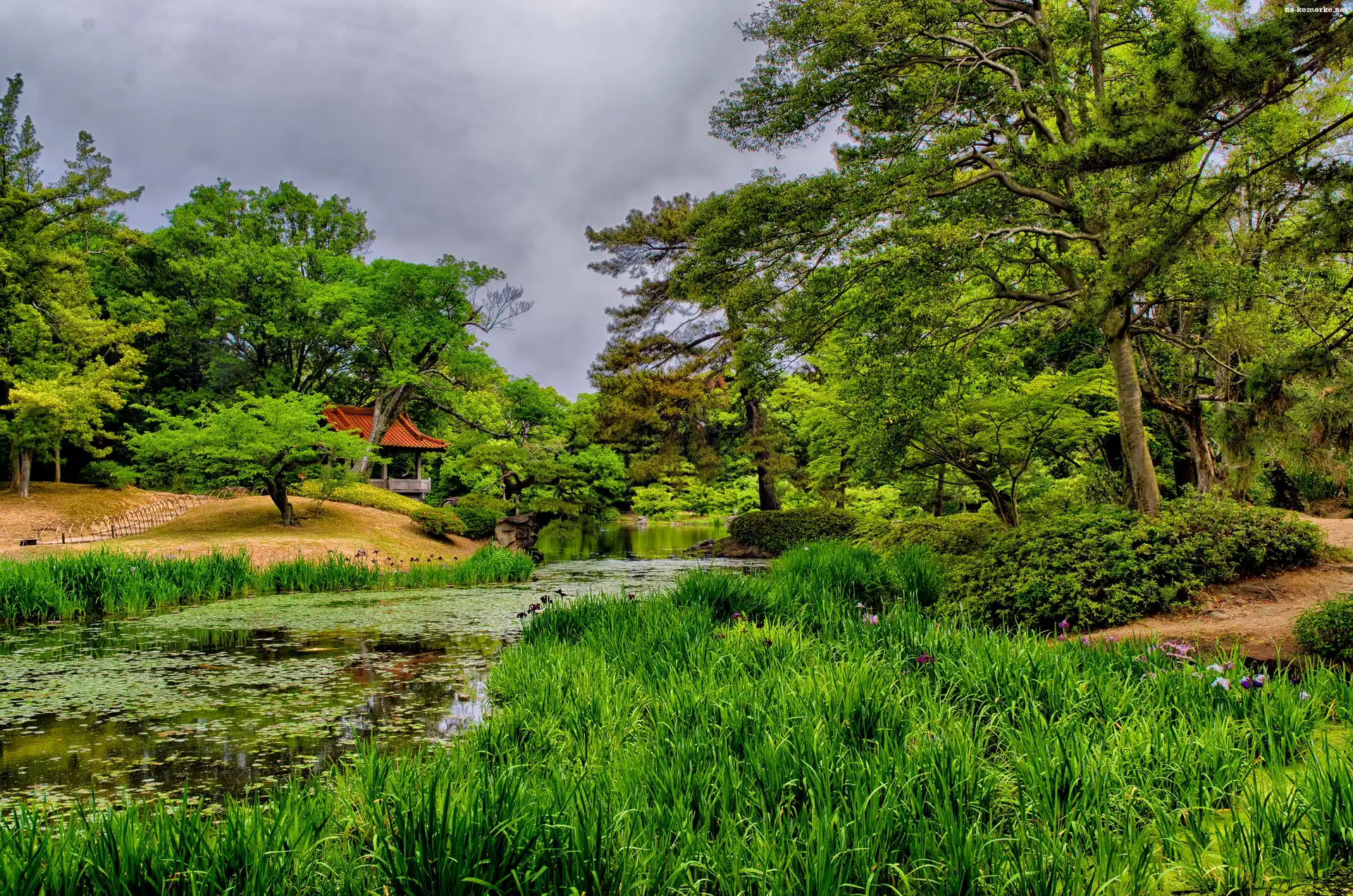 Drzewa, Park, Staw, Domek, Altanka na Komórkę