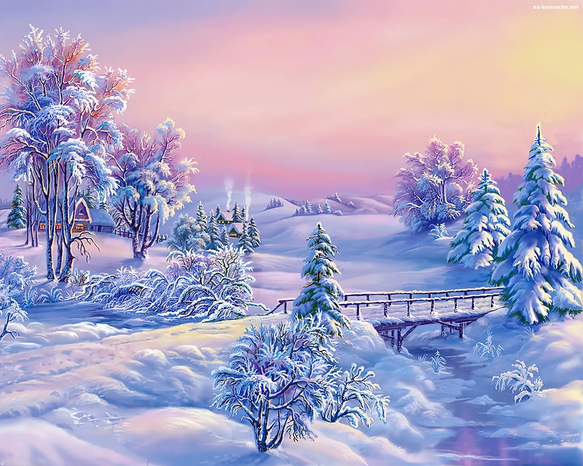 Drzewa, Zima, Domki, Śnieg na Komórkę