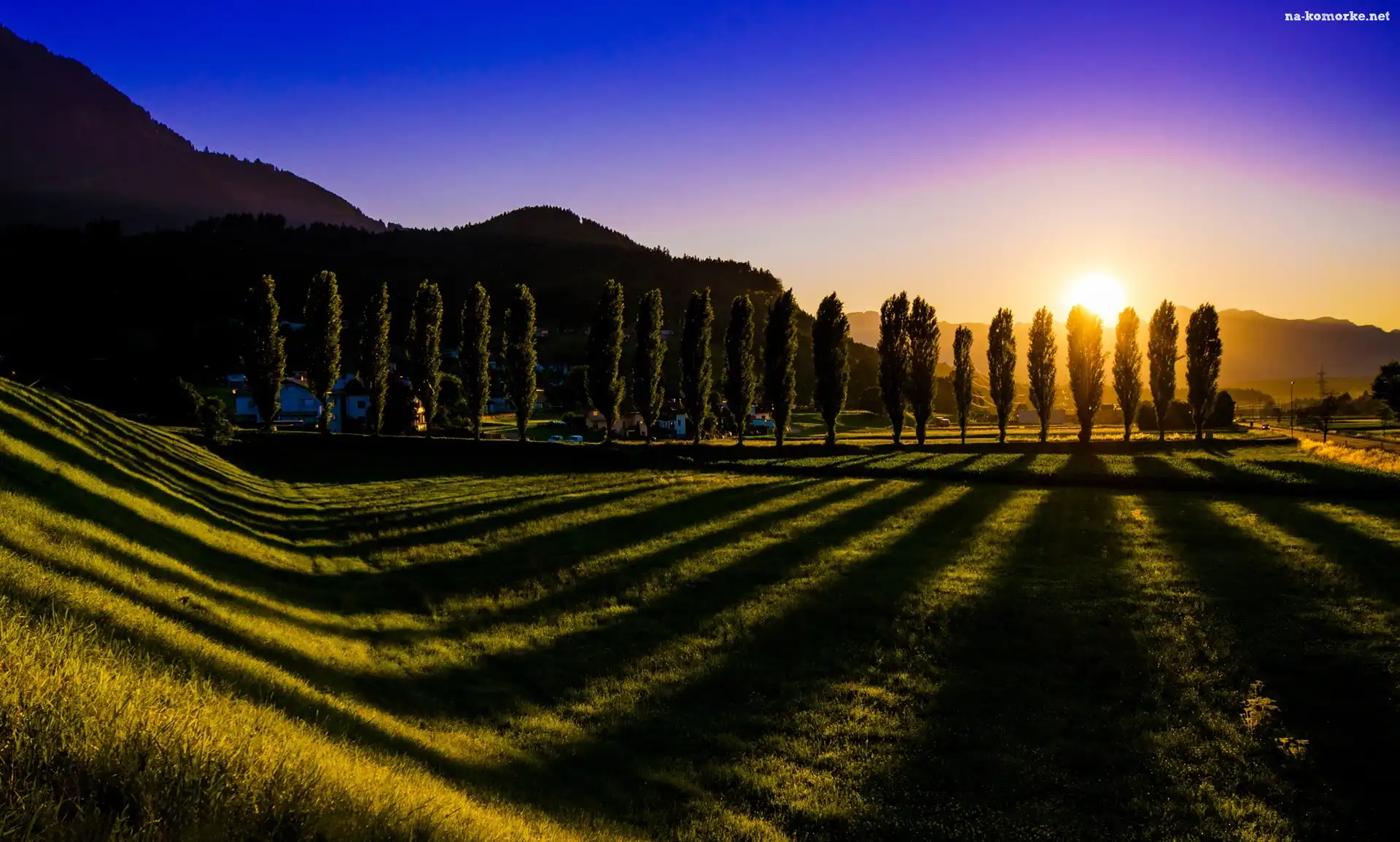 Domy, Drzewa, Wschód Słońca, Wzgórza, Cienie, Wieś na Komórkę