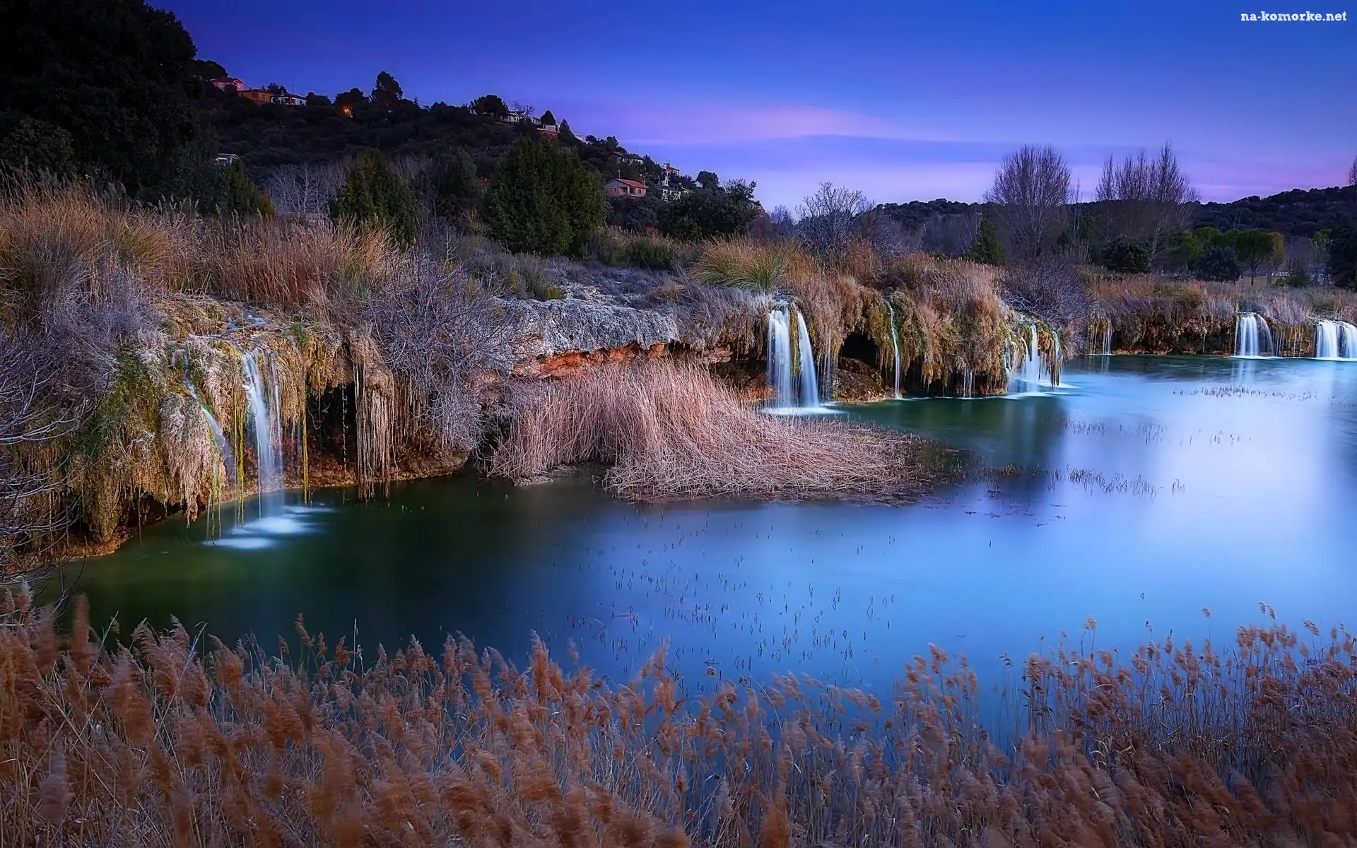 Drzewa, Jezioro, Wzgórze, Wodospady, Domy, Trawy na Komórkę