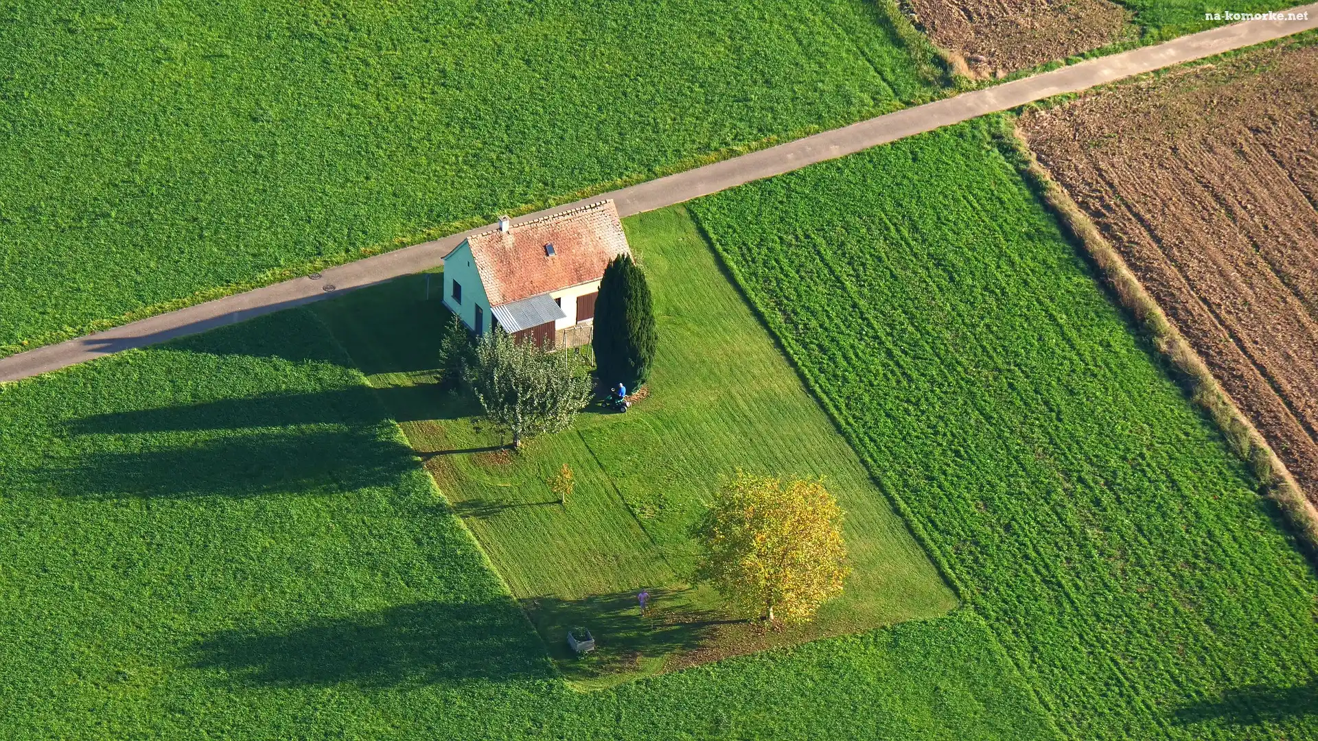 Pola, Dom, Droga, Drzewa, Z lotu ptaka na Komórkę