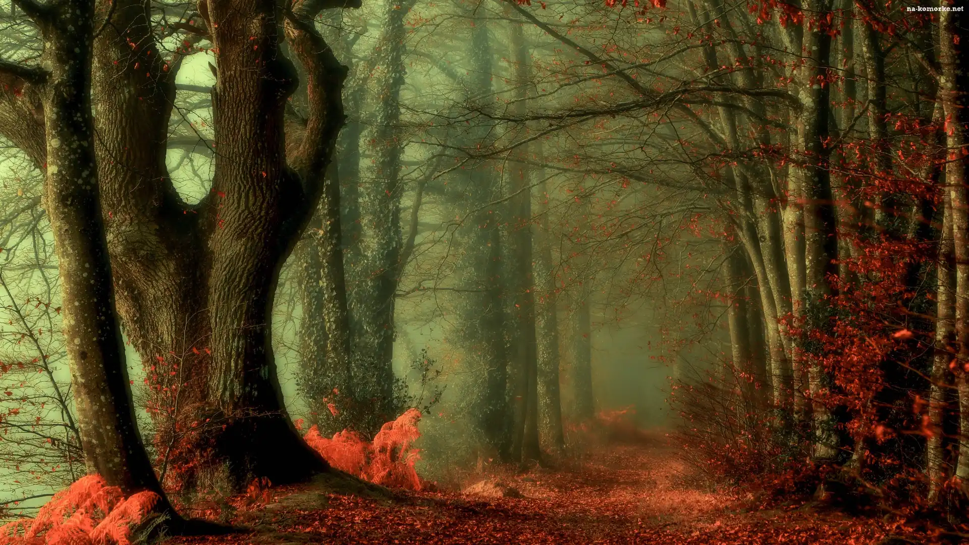 Drzewa, Las, Jesień, Mgła, Droga, Liście na Komórkę