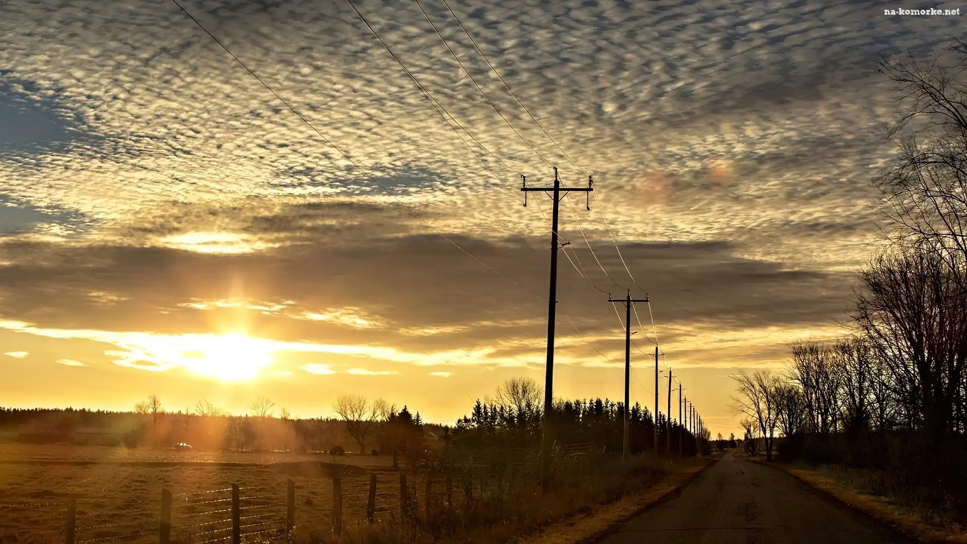 Drzewa, Zachód, Słońca, Droga, Słupy na Komórkę