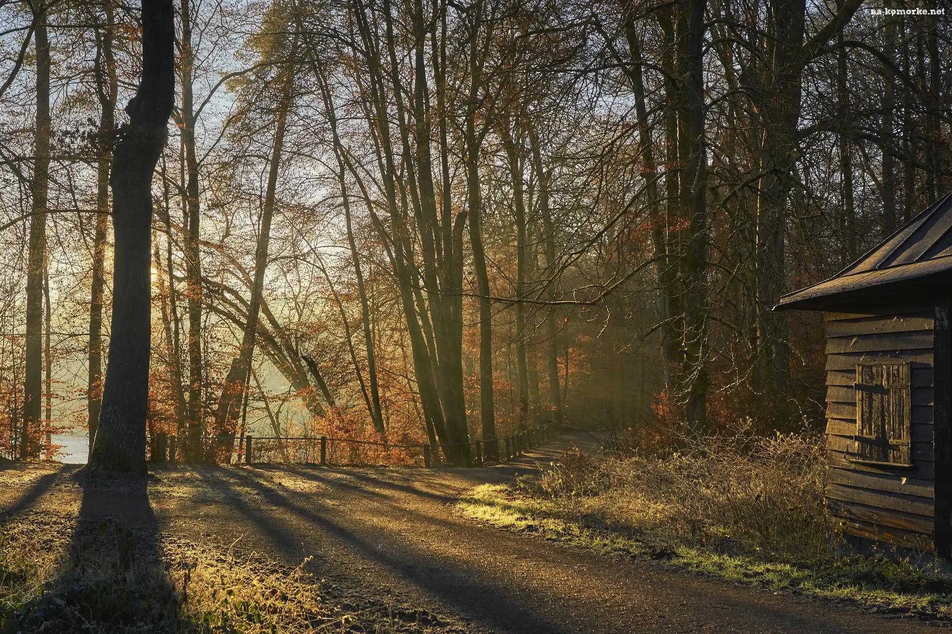 Droga, Drzewa, Jesień, Słoneczny blask, Las, Szopa na Komórkę