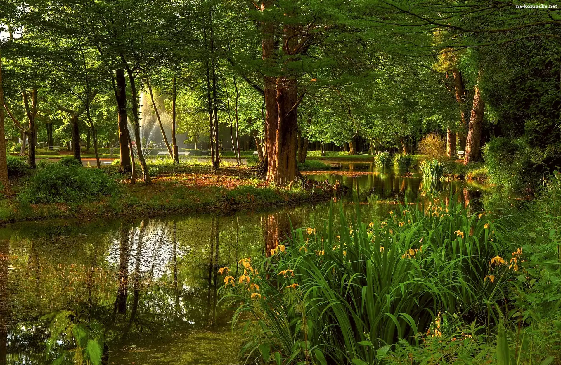 Drzewa, Park, Rzeczka, Fontanna, Lato na Komórkę