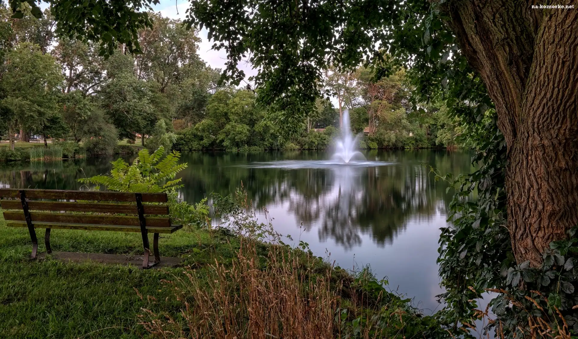 Drzewa, Park, Staw, Fontanna, Ławka na Komórkę