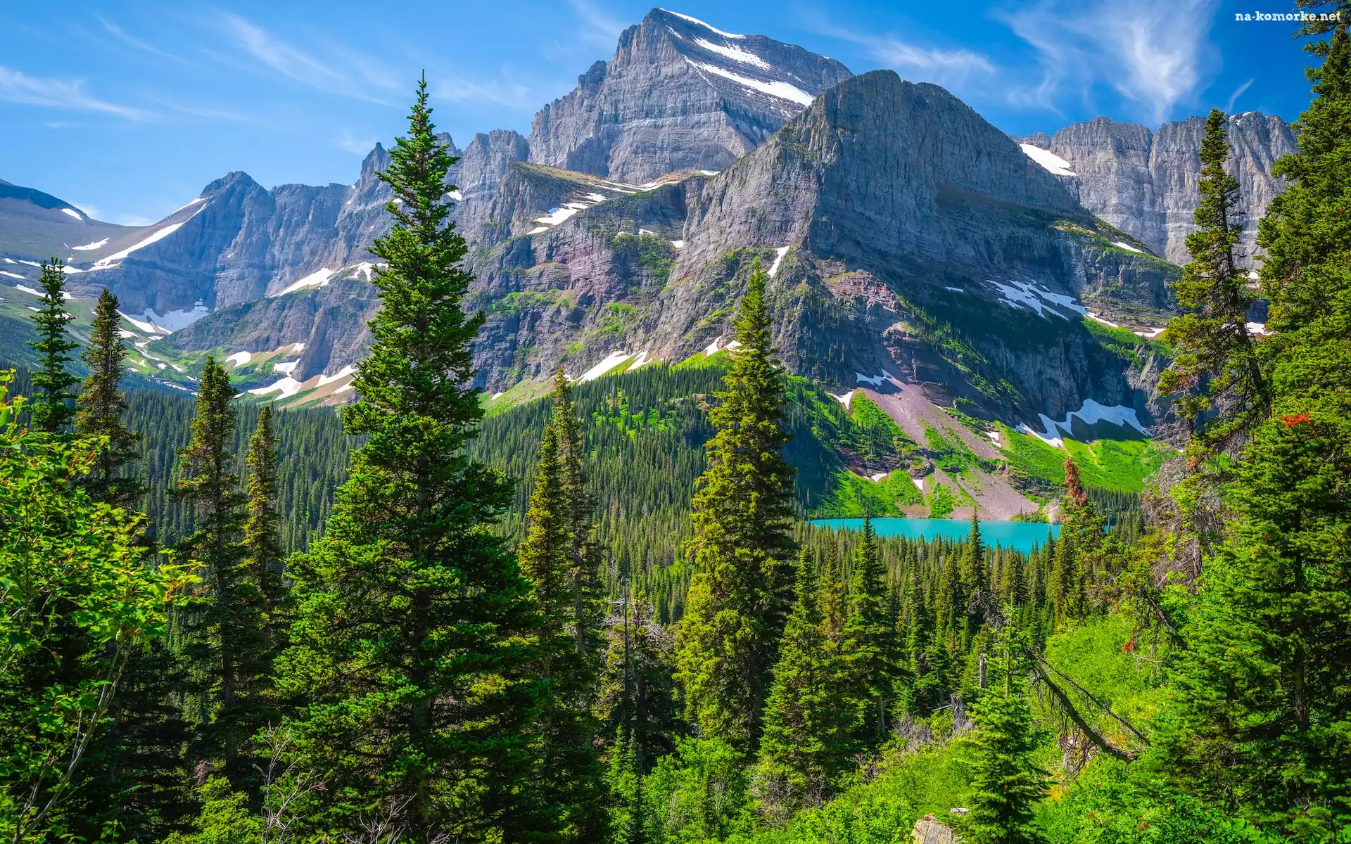 Park Narodowy Glacier, Lasy, Jezioro, Stany Zjednoczone, Grinnell Lake, Drzewa, Góry, Montana na Komórkę |