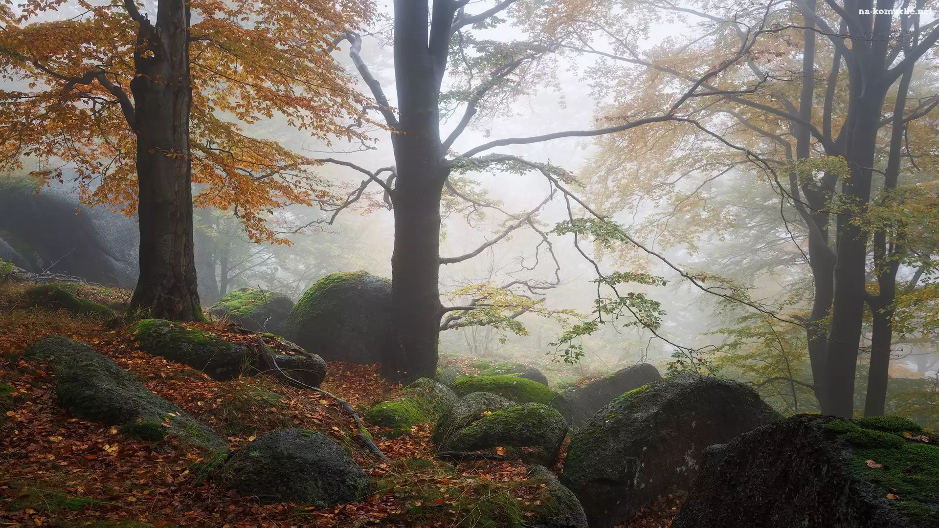 Jesień, Drzewa, Głazy, Las, Mgła na Komórkę