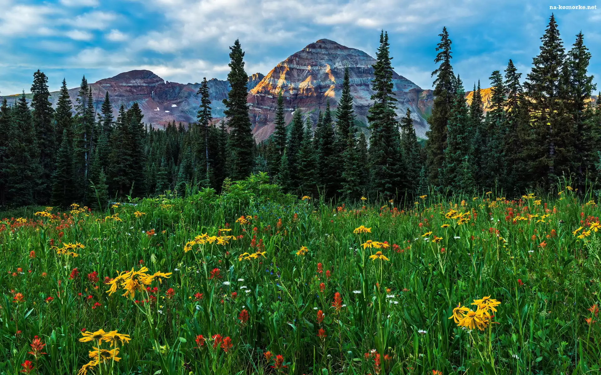Drzewa, Łąka, Chmury, Hesperus Peak, San Juan Mountains, Kolorado, Stany Zjednoczone, Kwiaty, Góry na Komórkę |