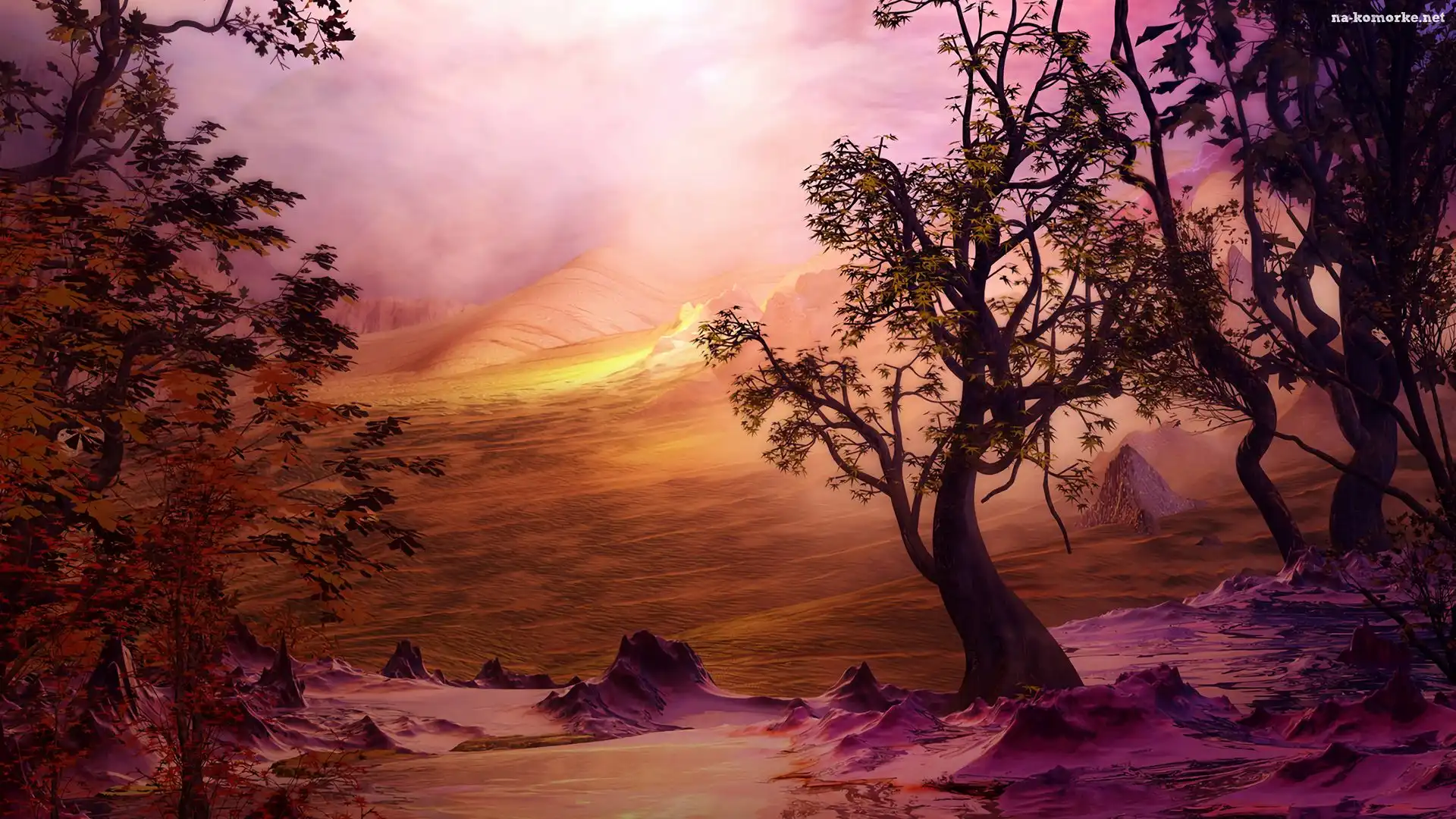 Drzewa, Grafika, Góry, Mgła na Komórkę
