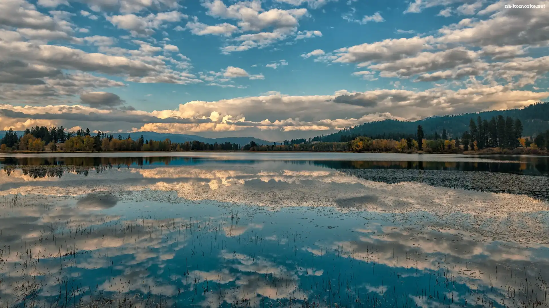 Drzewa, Jezioro, Jesień, Odbicie, Góry, Chmury na Komórkę