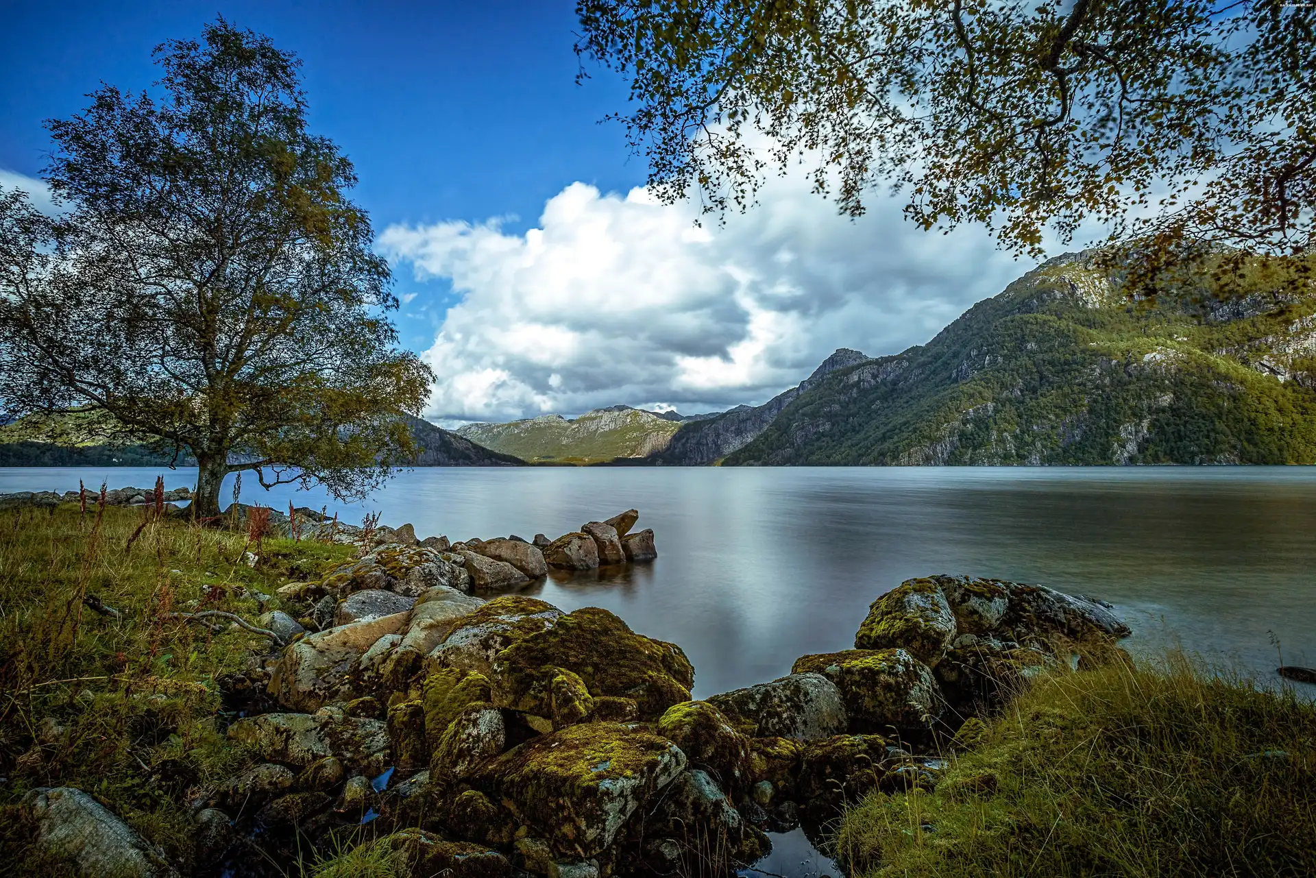 Drzewa, Norwegia, Jezioro, Góry, Kamienie na Komórkę