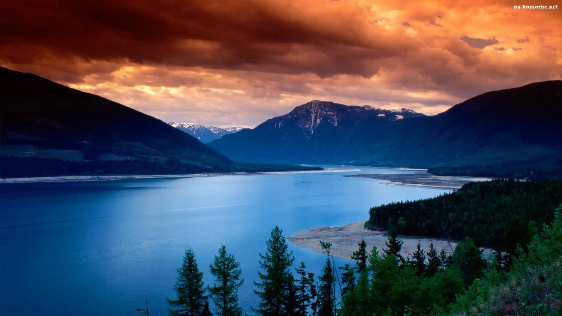 Drzewa, Plaża, Jezioro, Słońca, Góry, Zachód na Komórkę