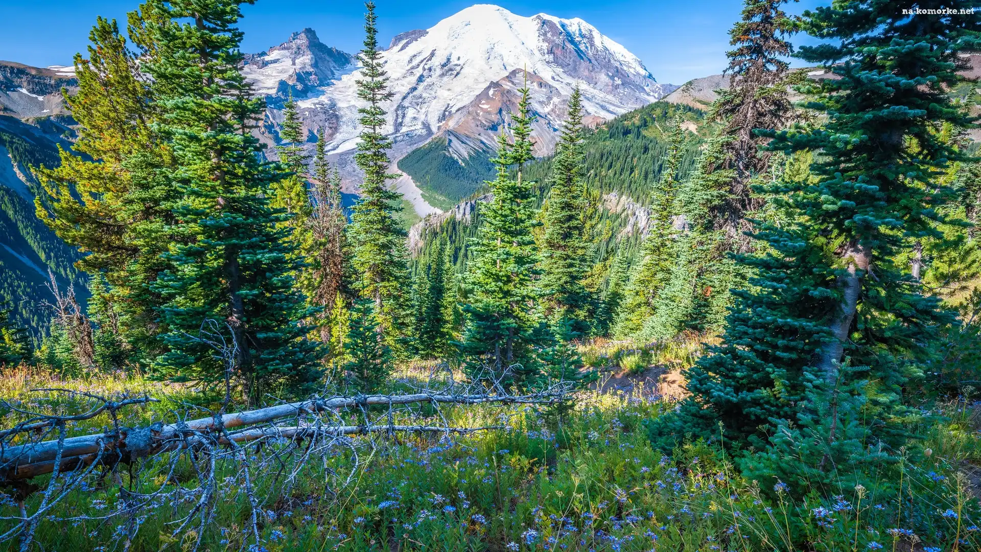 Góry, Stan Waszyngton, Stany Zjednoczone, Drzewa, Świerki, Park Narodowy Mount Rainier, Kwiaty na Komórkę |