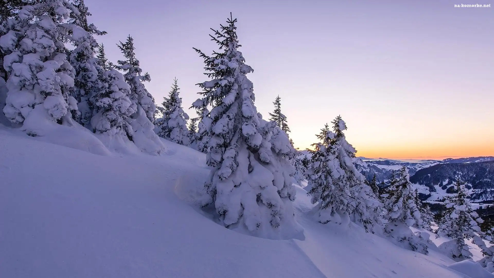 Drzewa, Zima, Szwajcaria, Śnieg, Góry, Świerki na Komórkę