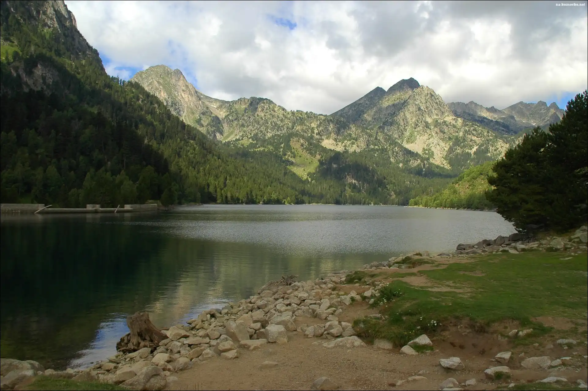 Drzewa, Jezioro, Woda, Góry, Kamienie na Komórkę