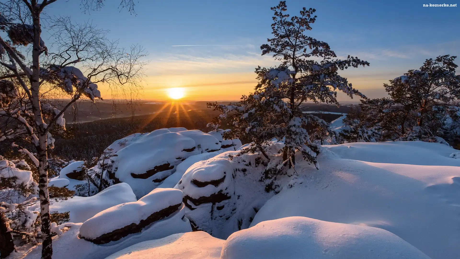 Drzewa, Zima, Zachód słońca, Góry, Śnieg na Komórkę
