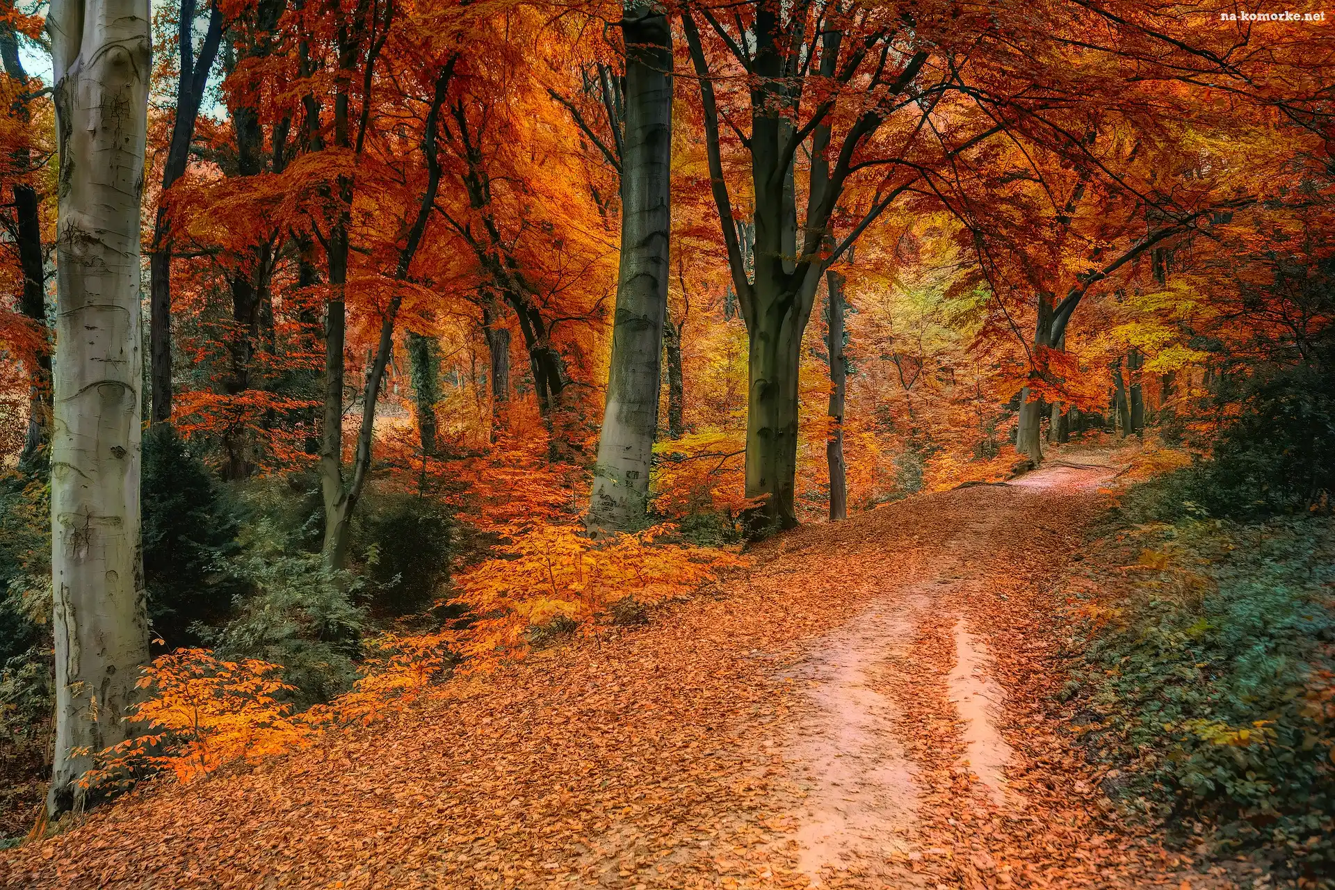 Jesień, Drzewa, Las, Droga, Opadłe, Liście, Kolorowe na Komórkę