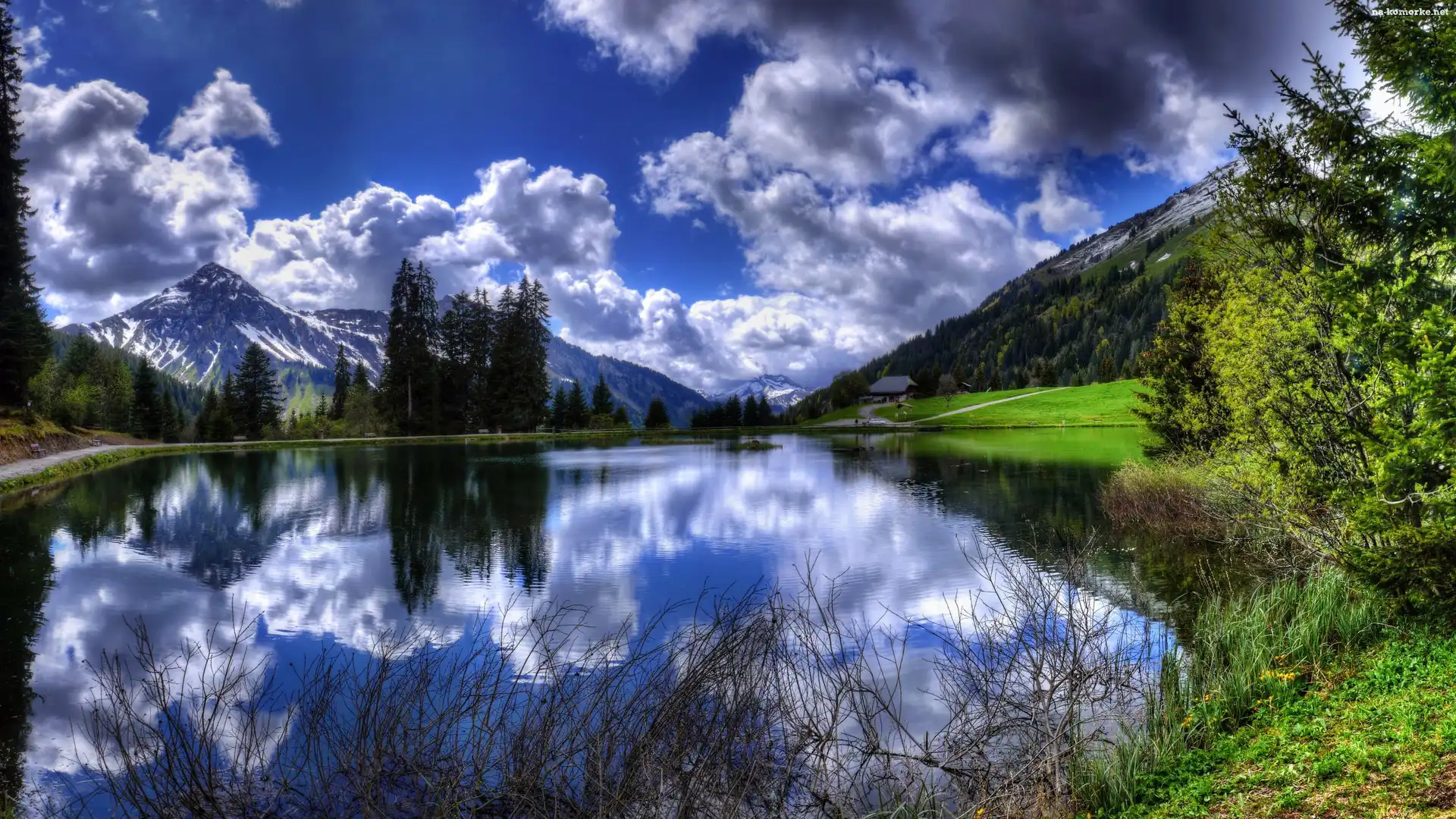 Drzewa, Chmury, Góry, Jezioro, Odbicie na Komórkę