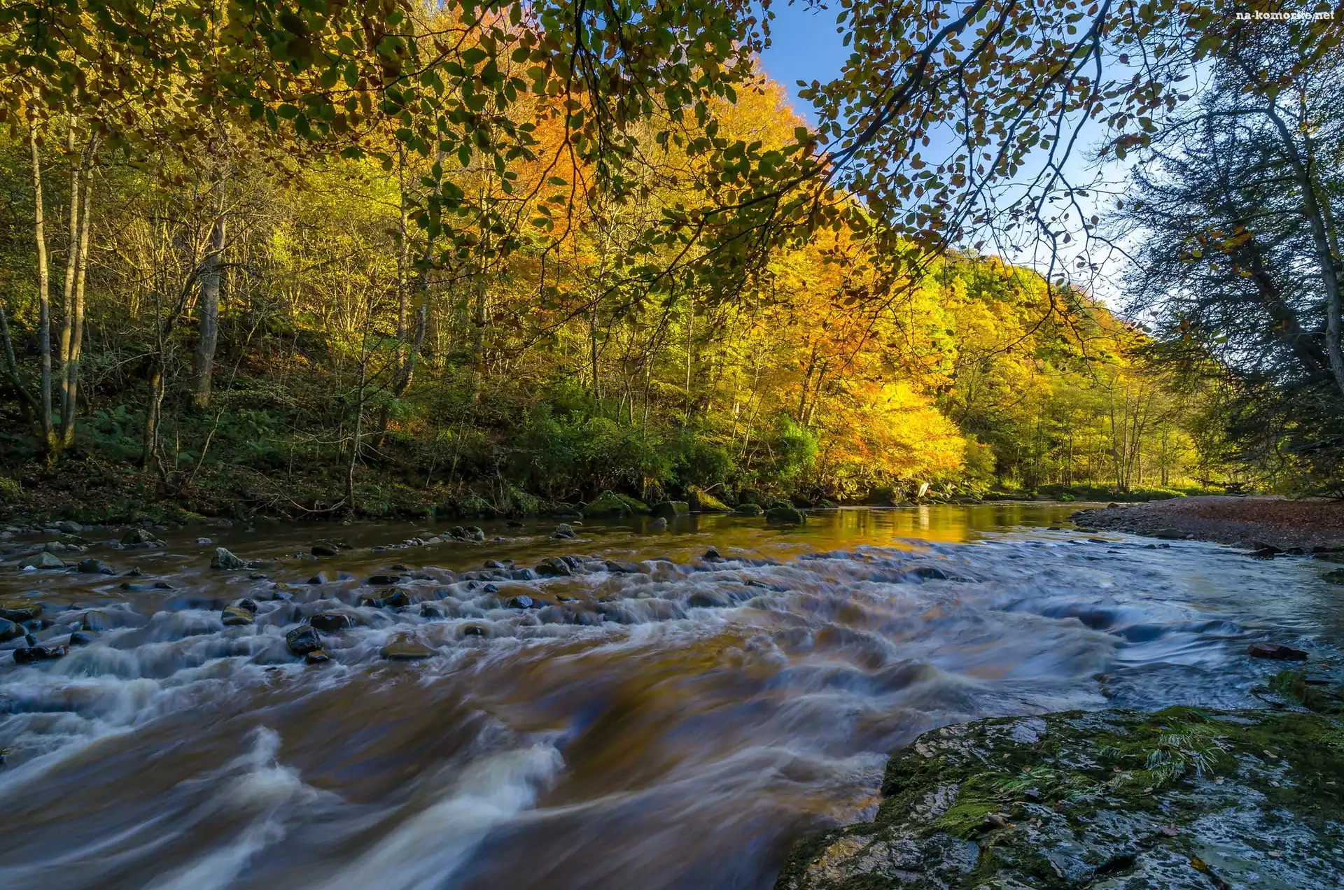 Drzewa, Jesień, Rzeka, Kamienie, Las na Komórkę