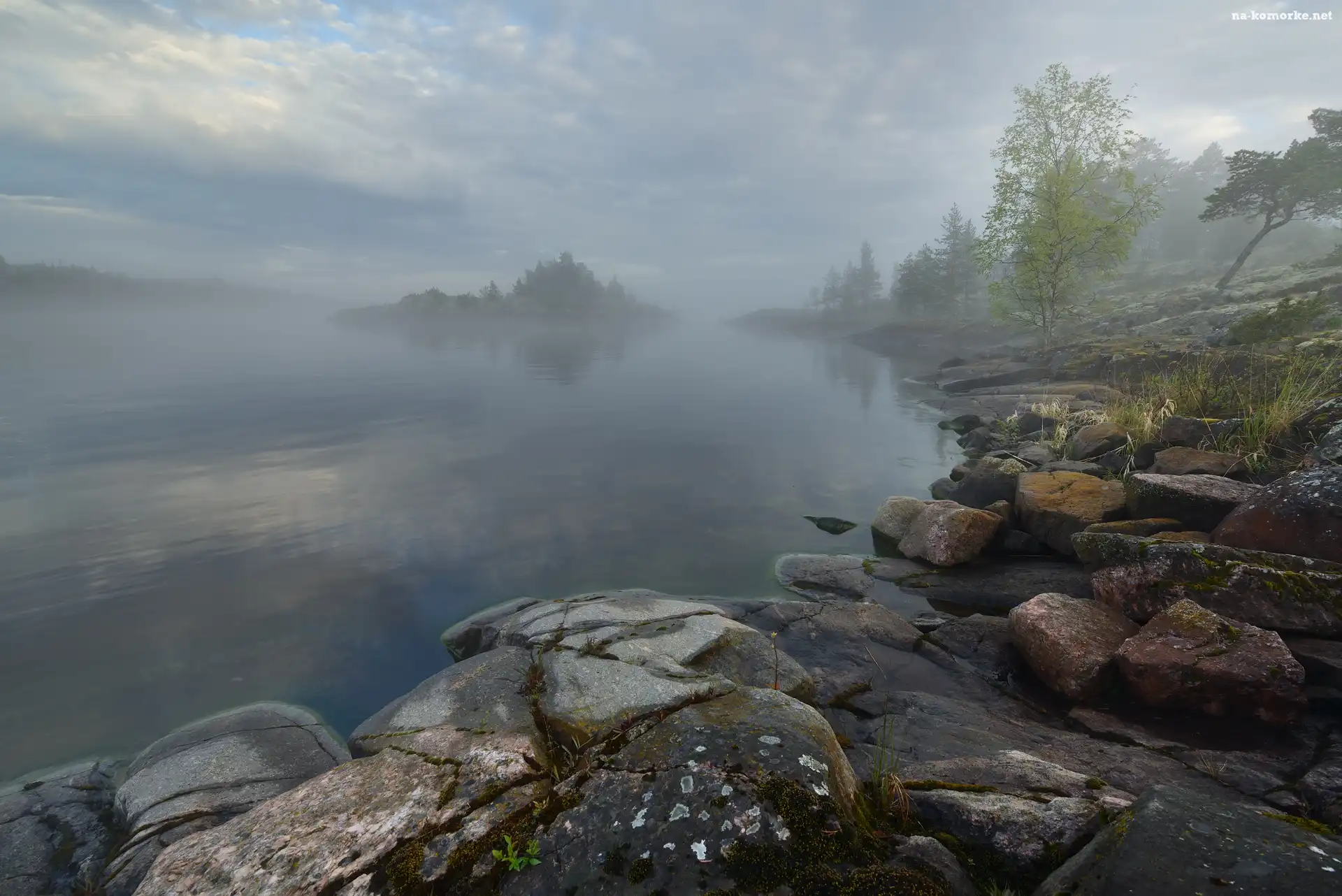 Jezioro Ładoga, Karelia, Brzeg, Rosja, Mgła, Skały, Kamienie, Drzewa na Komórkę