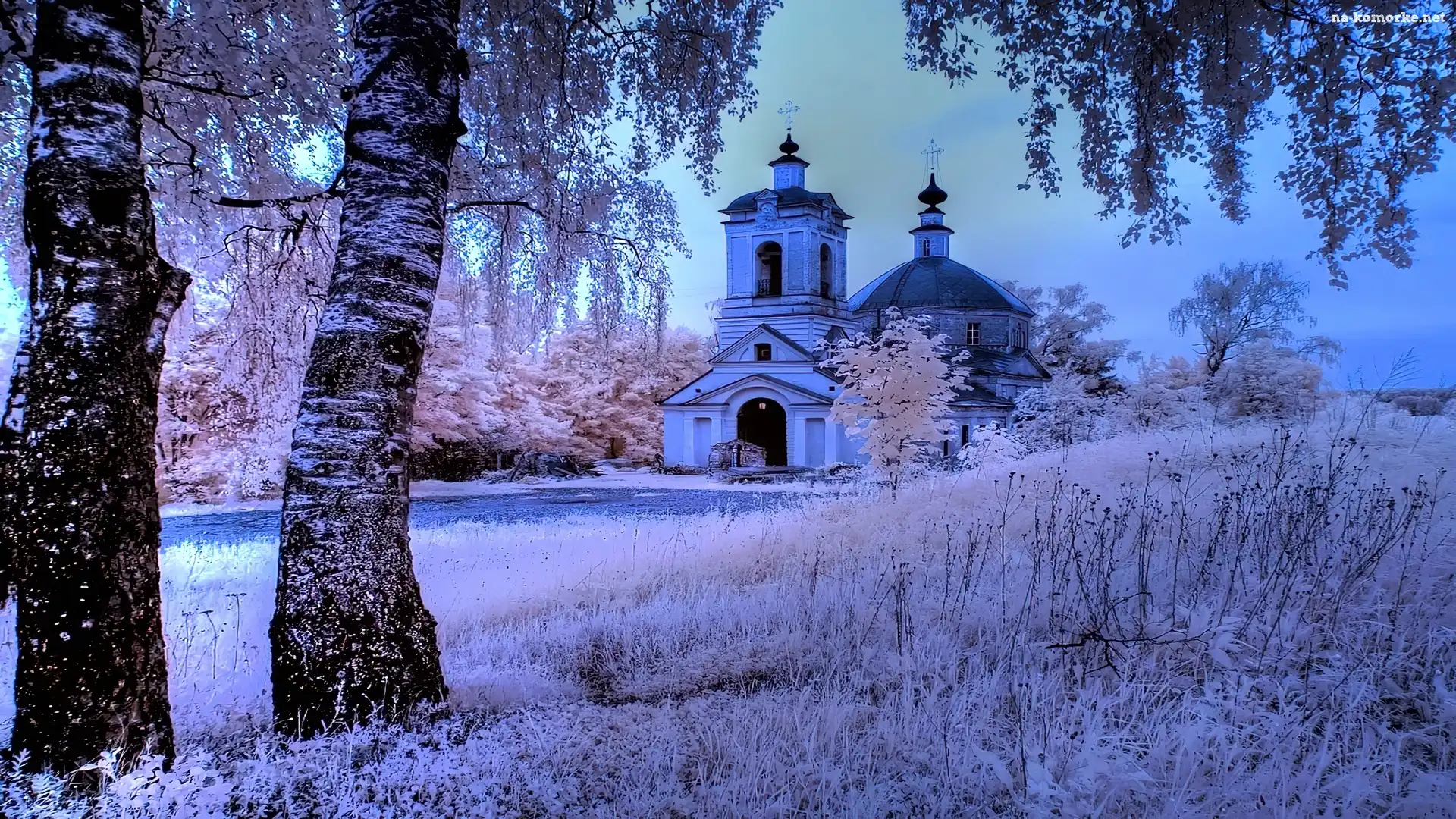 Kościół, Drzewa, Zima na Komórkę
