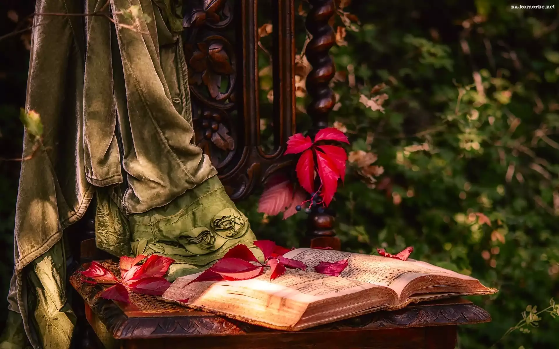 Drzewa, Liście, Książka, Ogród, Krzesło, Dekoracja na Komórkę