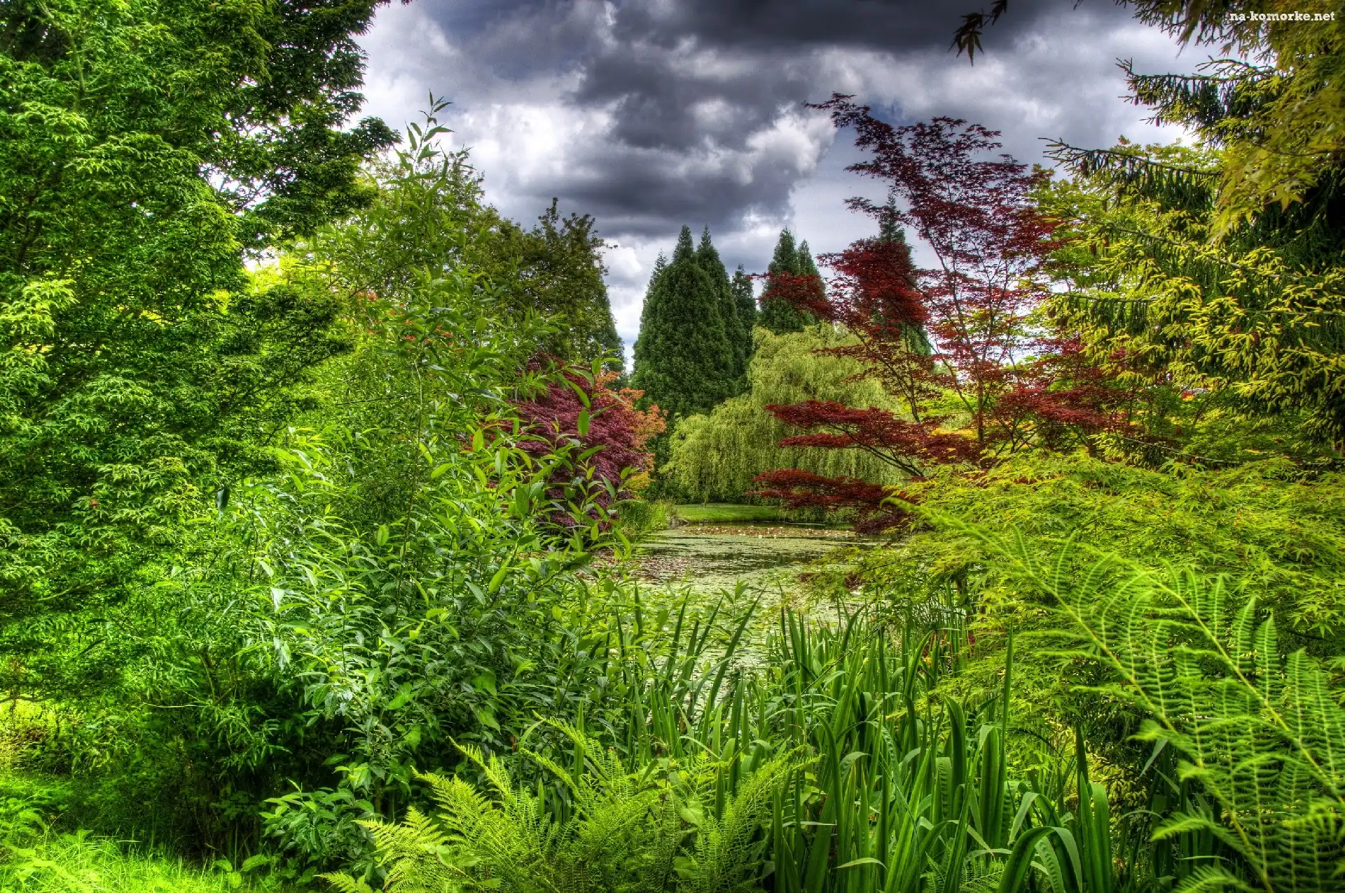 Las, Krzewinki, Ścieżka, Drzewa Różowe, Kwiaty Owoc, Ostrokrzew, Czerwone, Liście, Granatowy Krzewy, Las, Żółte, Zielone, Drzewa Perukowiec, Podolski Droga, Krzewy, Drzewa, Brzozy Krzew, Kwiaty Góry, Niebo, Krzew Fioletowa, Magnolia Rozkwitająca, Magnolia Krzewy, Chmurki, Pagórek, Białe Kwitnący, Listki, Krzew, Kwiaty Park, Rododendrony, Altana, Kolorowe Jaśmin