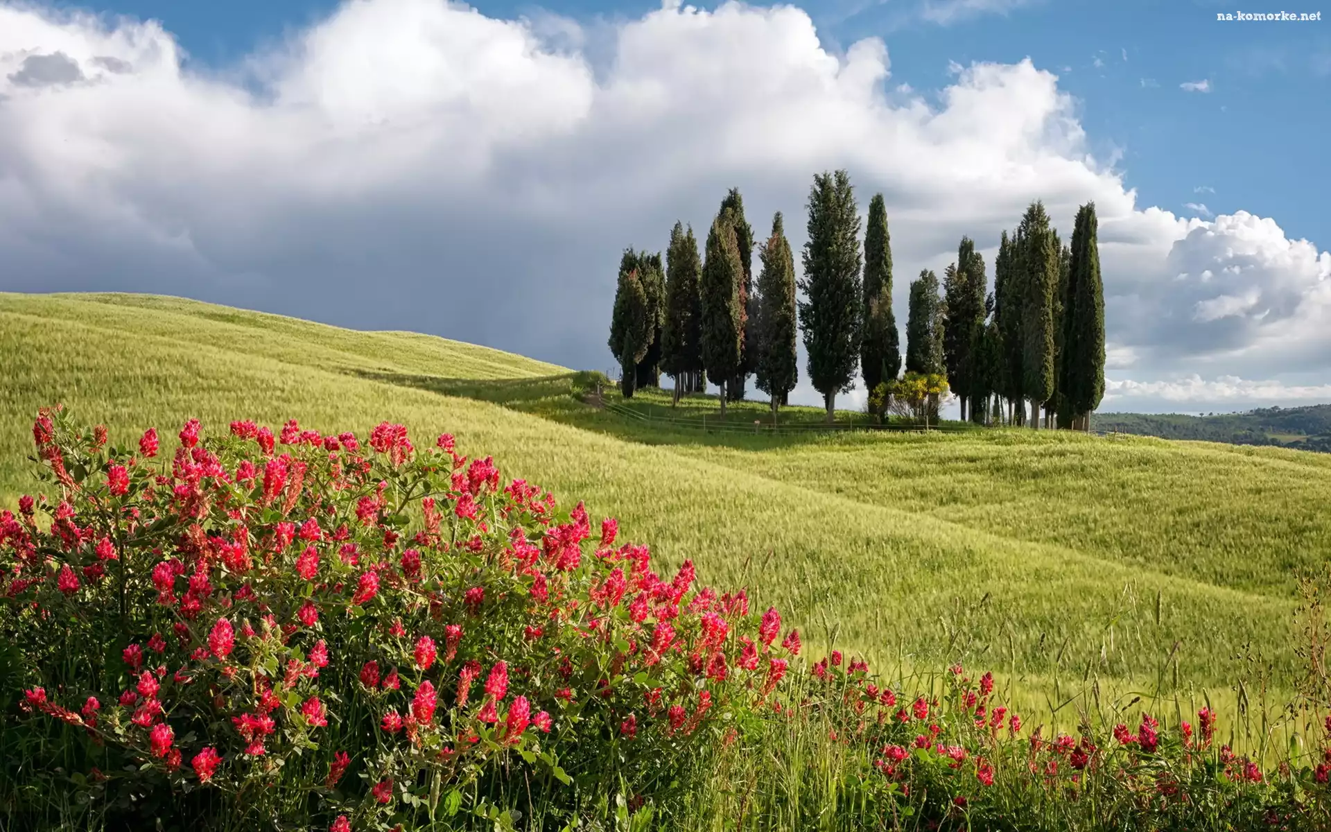 Drzewa, Łąki, Góry, Włochy, Kwiaty, Toskania na Komórkę